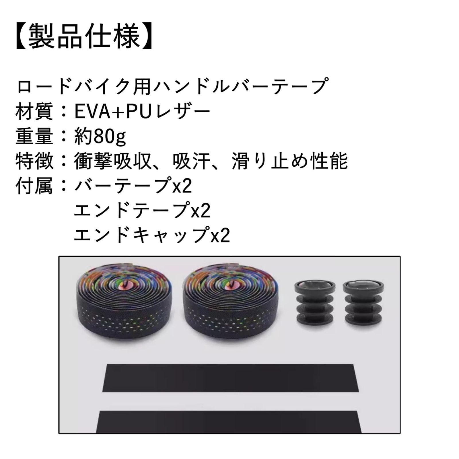 商品内容:バーテープ×2本、エンドキャップ×2個、エンドテープ×2枚 寸法:長さ2150mm 幅30mm 厚み3.0mm 重量:80g 材質:EVA+PU