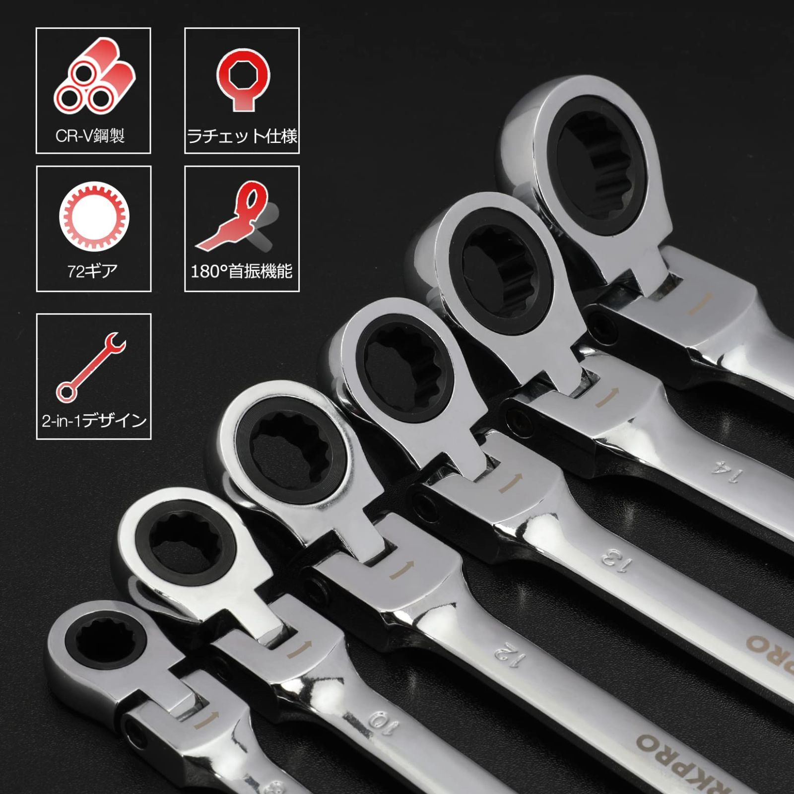 WORKPRO フレックスラチェットレンチ 首振りラチェット コンビネーションレンチセット コンビセット 両用ヘッド スパナ レンチ 角度調整可能 72ギア 6本組 自動車修理 車メンテナンス 組み立て DIY用 収納袋付き