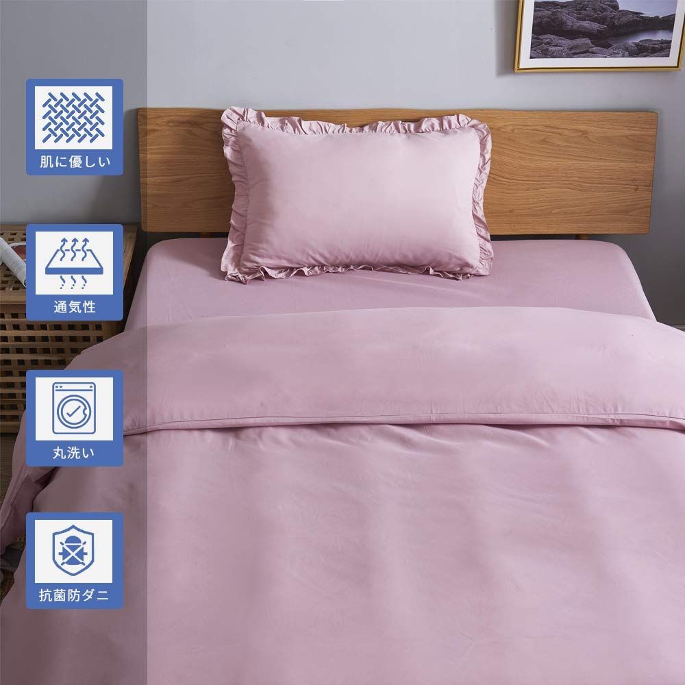 HOdo Home 布団カバー シングル 3点セット 掛け布団カバー ベッドカバー 枕カバー ベッドシーツ ボックスシーツ 洋式・和式兼用 寝具カバーセット フリル付き ピーチスキン加工 洗い替え 速乾(シングル ピンク)