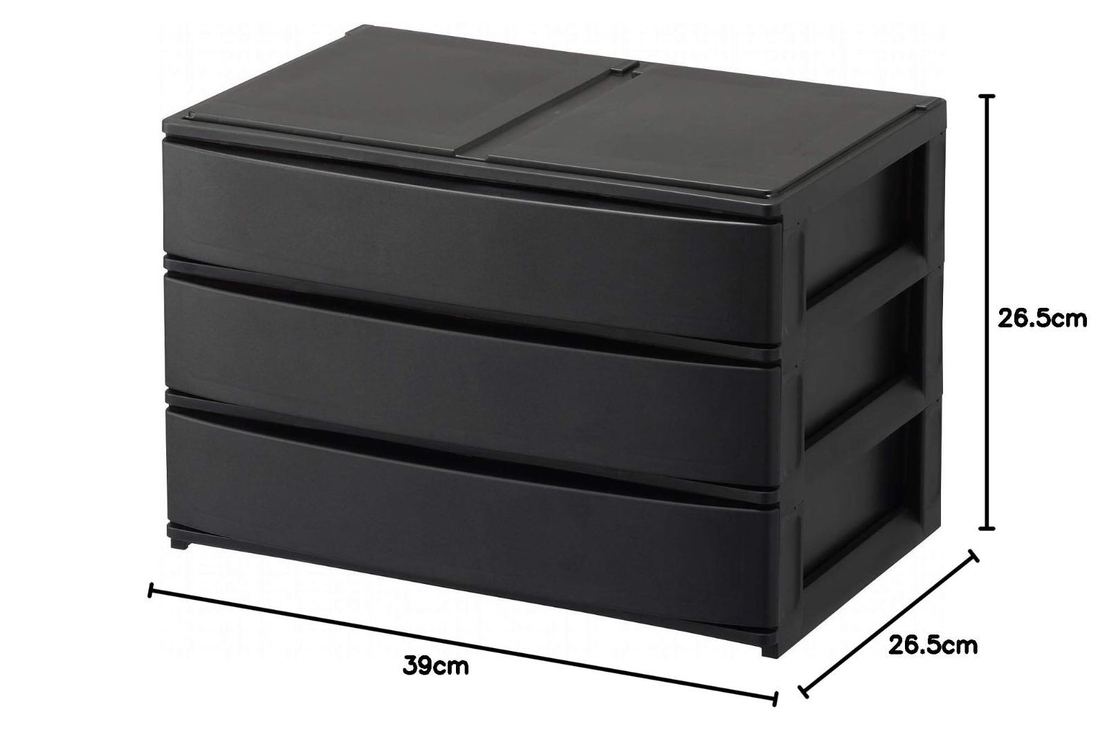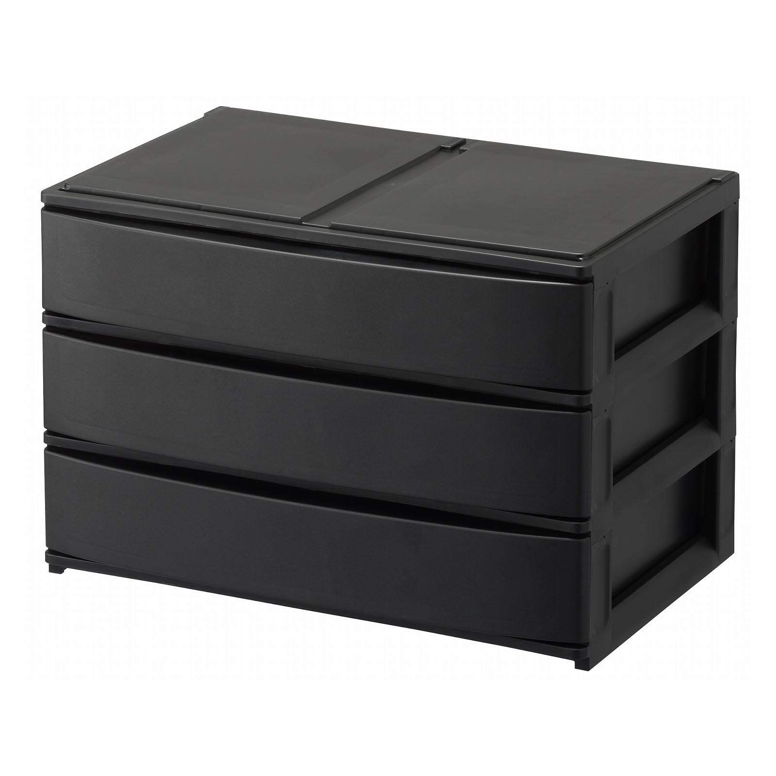 サンカ ポスデコ カラーボックスにピッタリフィット 引き出し収納ボックス ワイド 浅3段 ブラック ずれを防ぐラバーストッパー 重ねて使える スタッキングチェスト ロック機構 日本製 カラーボックス 収納ケース 小物 衣装 ボックス (幅39x奥行26.5x高さ26.5cm) NpdW-DBK