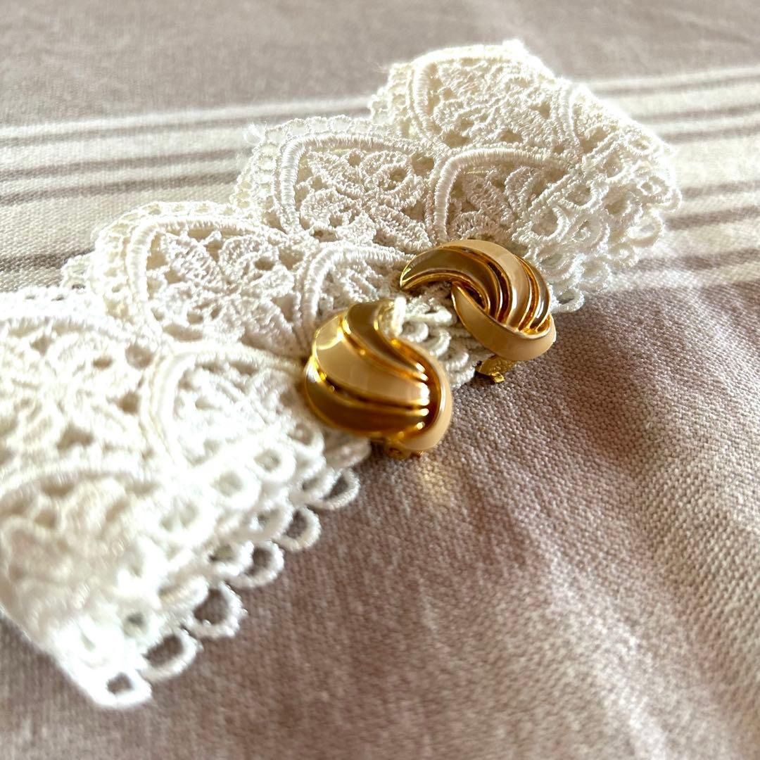ベージュとカフェオレブラウンの流線型モチーフがステキなビンテージイヤリングです。ゴールドがアクセントになったシックなアイテム