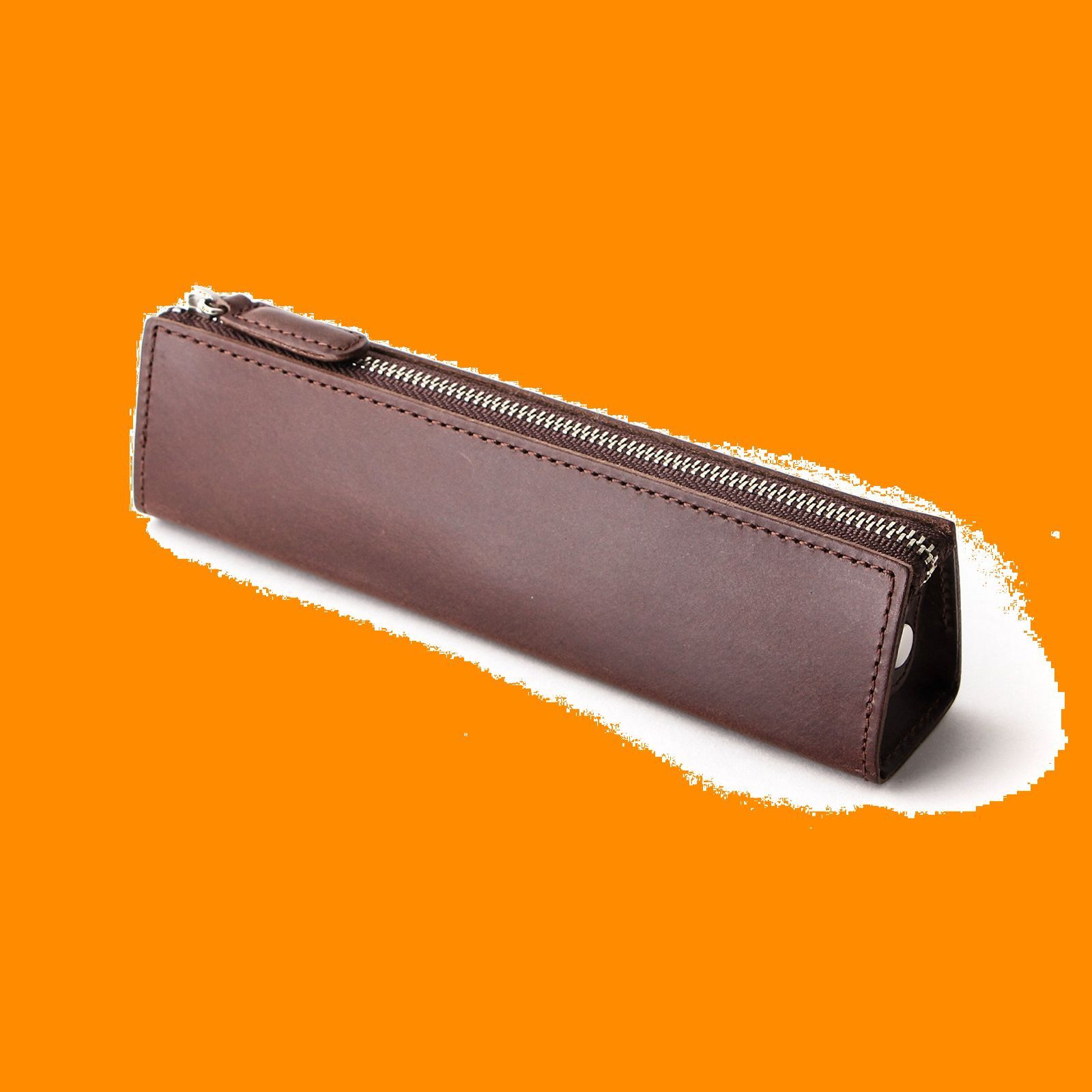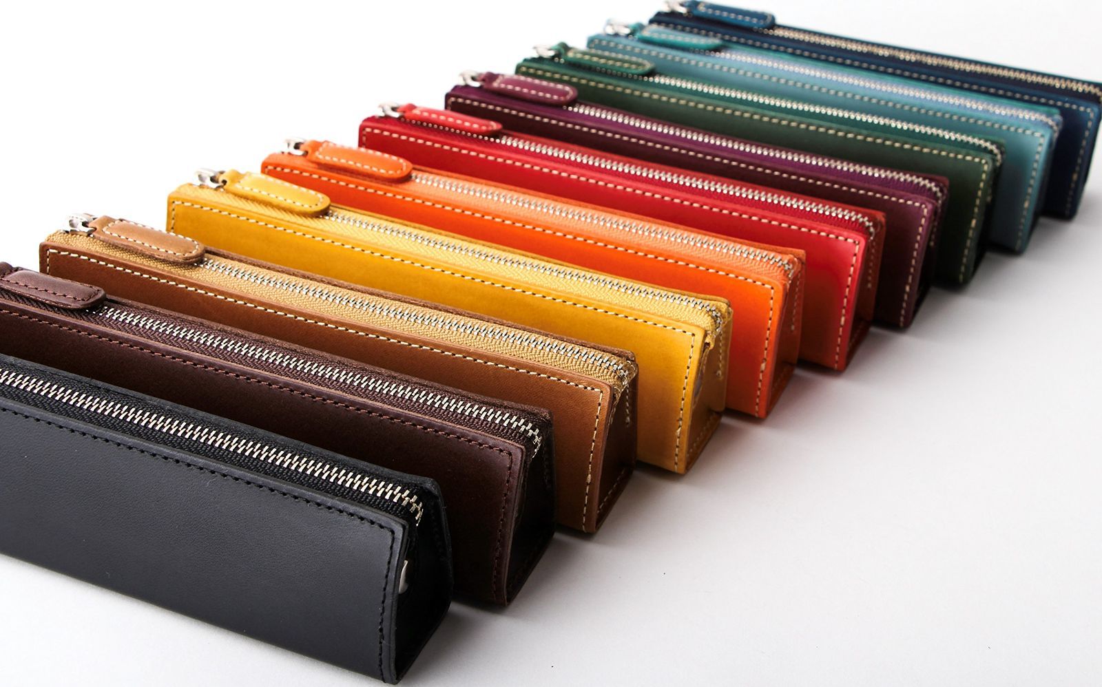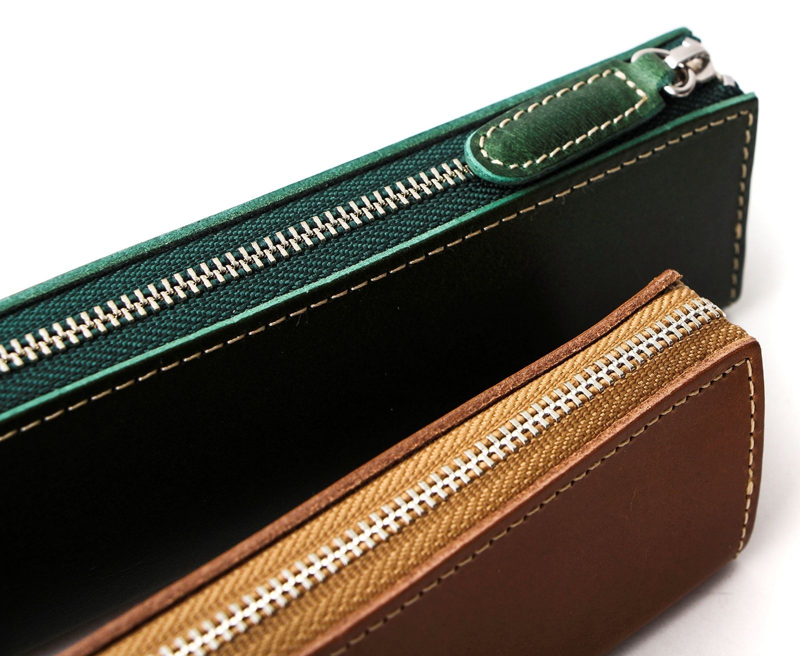 素材:イタリアン・ナチュラルタンド・レザー、ファスナー部分は使用していない時はホックボタンでスッキリと留めることができます。ファスナー部分が他の荷物とからむことも無いので、大人はもちろんのこと荷物が多い高校生にもおすすめの筆箱です。
