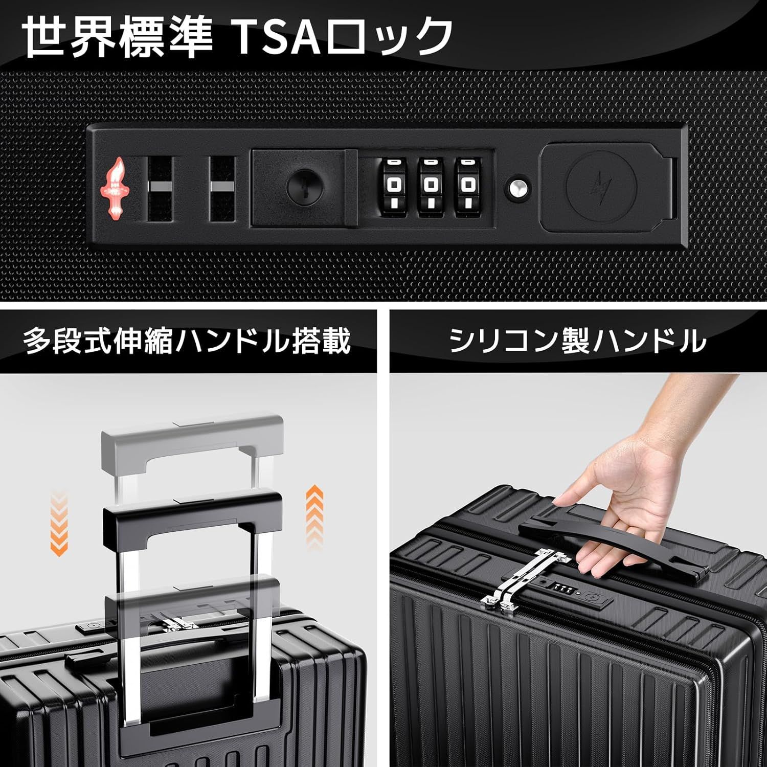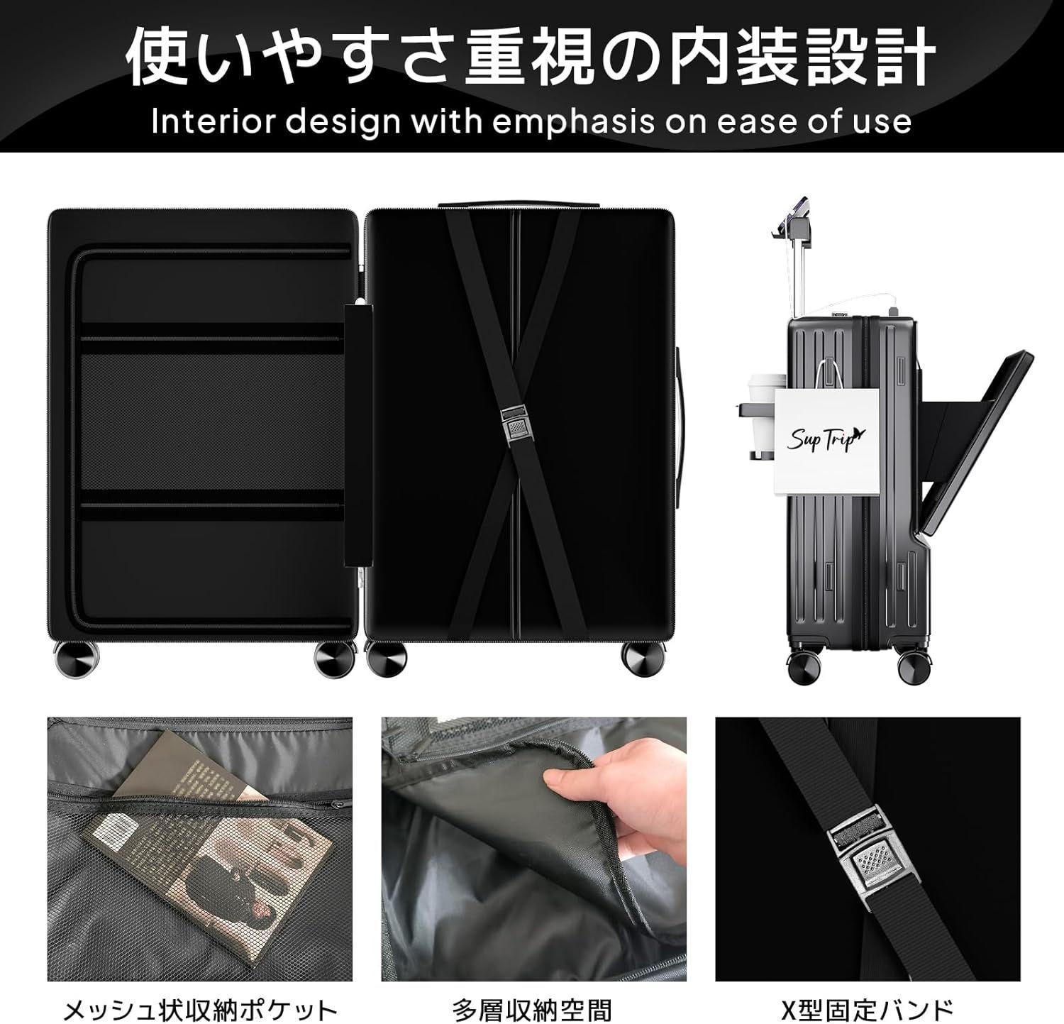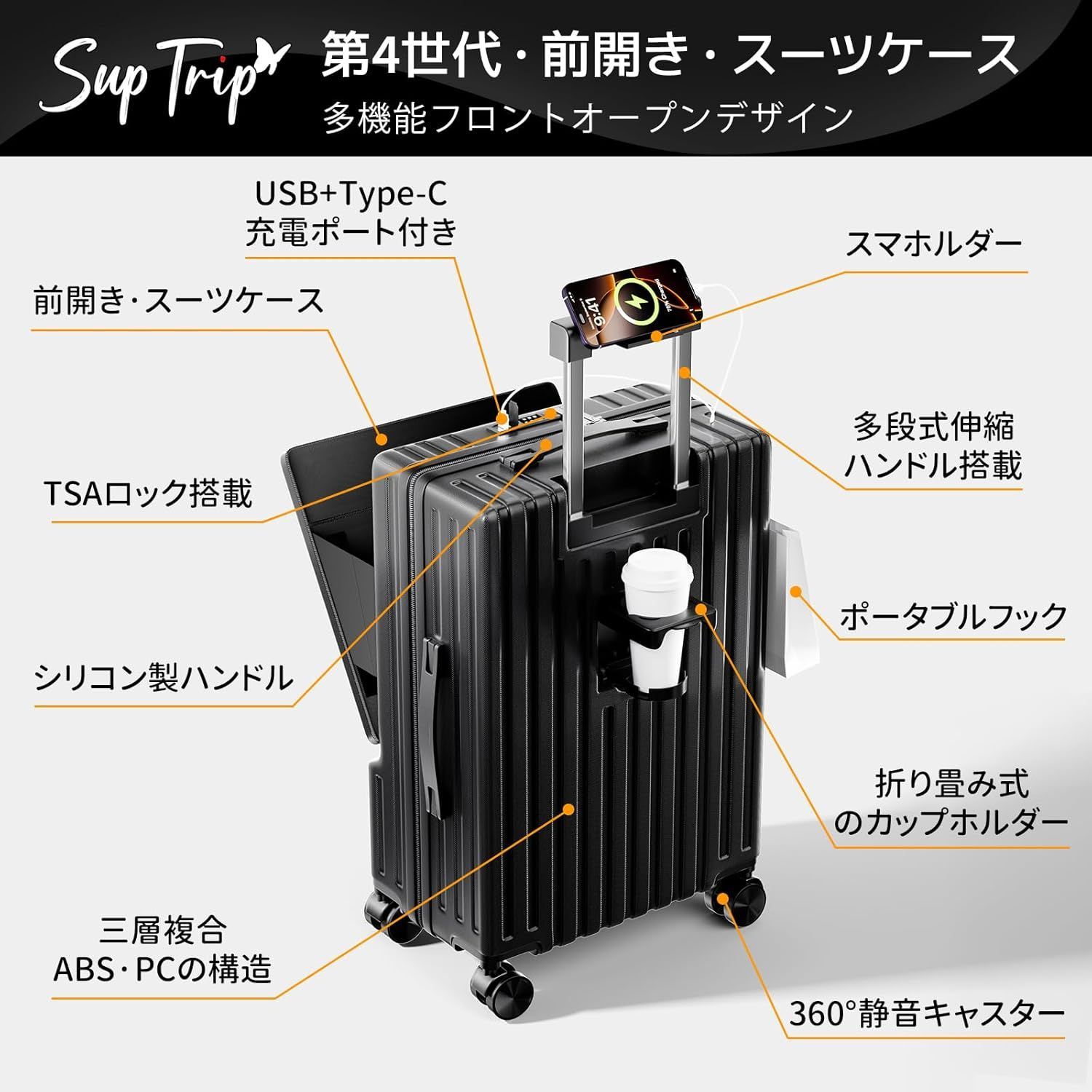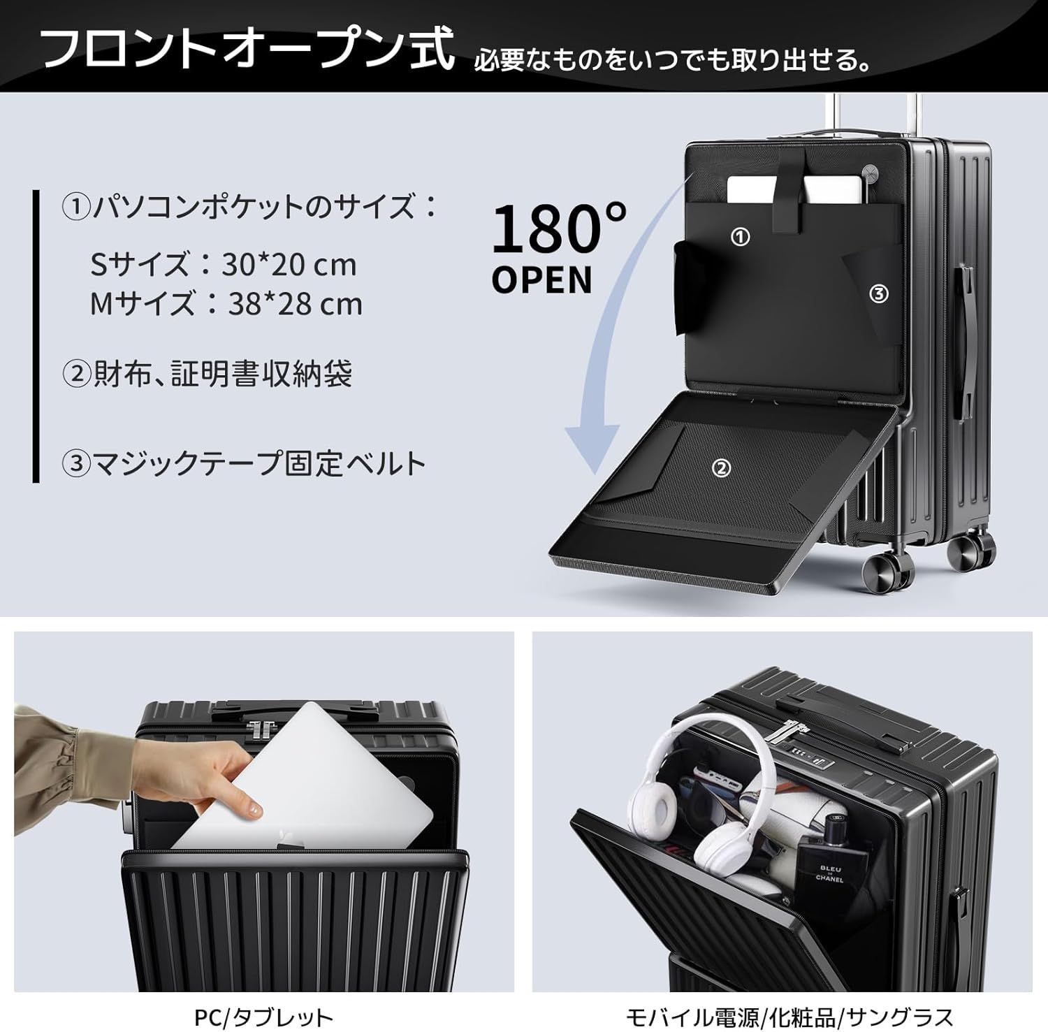 【第4世代·前開き·スーツケース】新世代の革新的なフロントオープンデザイン。例えば空港や電車内などの狭い空間、小物の出し入れも簡単にでき、スーツケースを全開にする必要がありません。