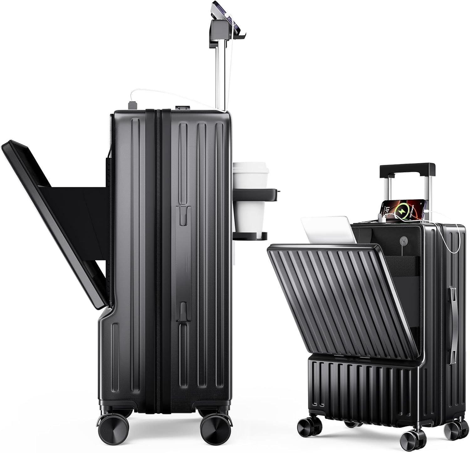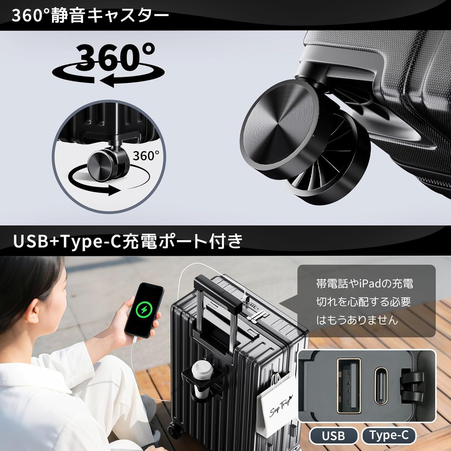 【Type-C&USBポート+飲料スタンド+携帯スタンド多機能キャリーケース】 ①TYPE-CとUSB充電ポートを備え、いつでも電子機器を充電できます。