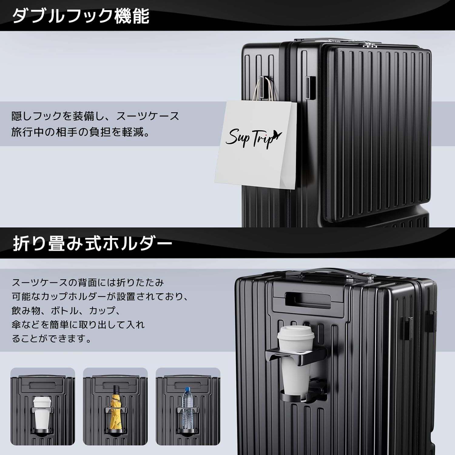 ②スーツケースの背面には折りたたみ可能なカップホルダーが設置されており、飲み物、ボトル、カップ、傘などを簡単に取り出して入れることができます。