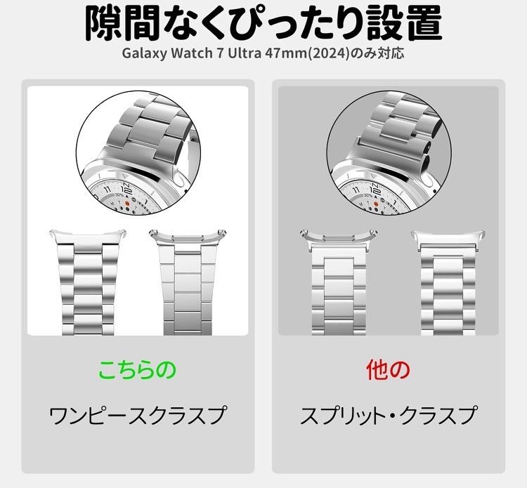 【対応機種】この隙間ないの金属ステンレス スチール バンドはGalaxy Watch Ultra 47mm(2024/2025)のみ対応。★ご注意:Galaxy Watch 7/6/5/4 44mm 40mm、Galaxy Watch FE、Galaxy Watch 6 Classic 47mm 43mm、Galaxy Watch 5 Pro 45mm、Galaxy Watch 4 Classic 46mm 42mm、Galaxy Watch Active 2/Active 44mm 40mmには対応していません。