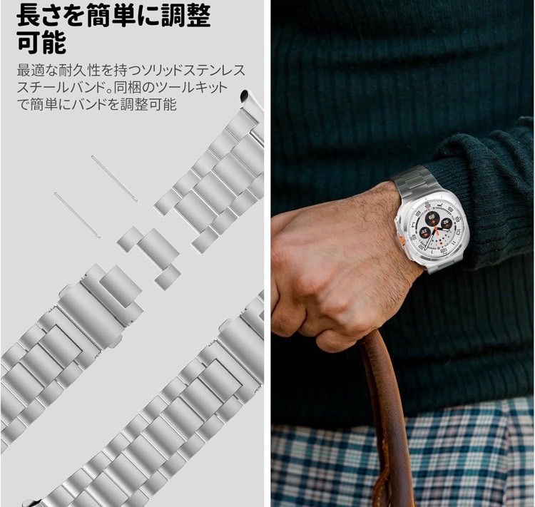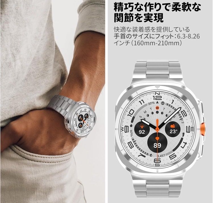 【調整可能な隙間なしバンド】!!! (ピンがない場合やその他の質問がある場合は、ぜひご連絡ください。)このバンドはGalaxy Watch Ultra 47mmのみ対応です。また、このバンドの長さは、簡単に調整でき、手首にフィットします。適合する手首サイズは6.3インチ~8.26インチ(160mm~210mm)です。追加のリンクでGalaxy Watch Ultraバンドの長さを増やすことができます。リンクの取り外しも取り付けも簡単です。