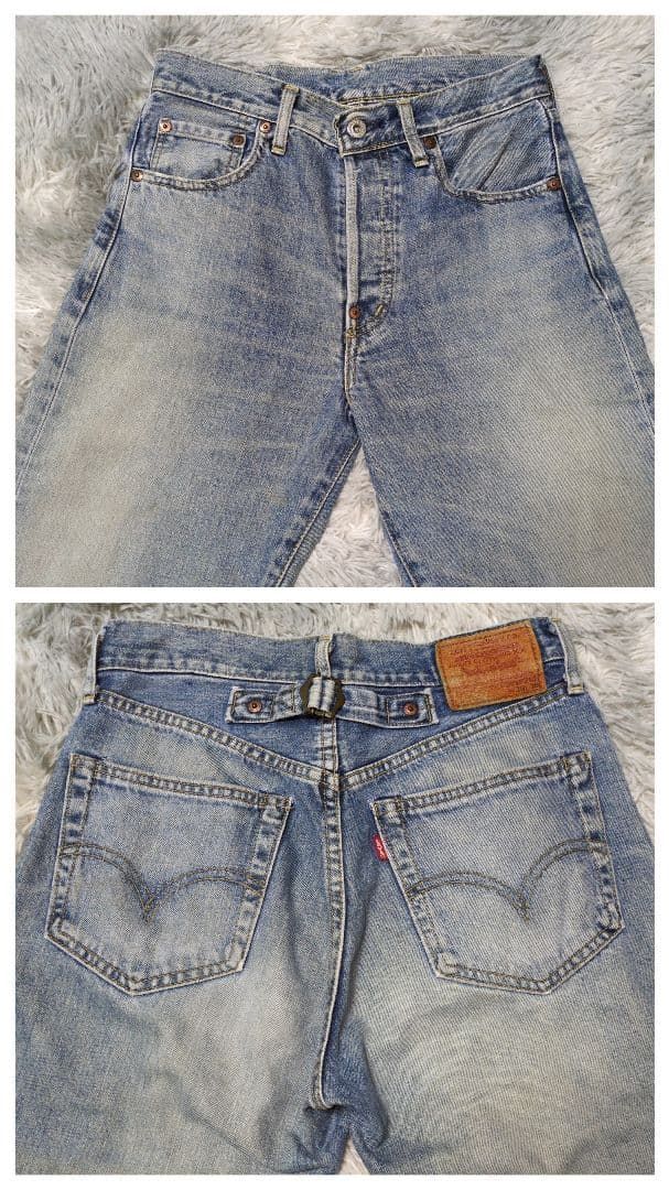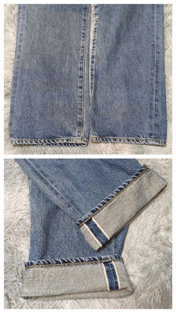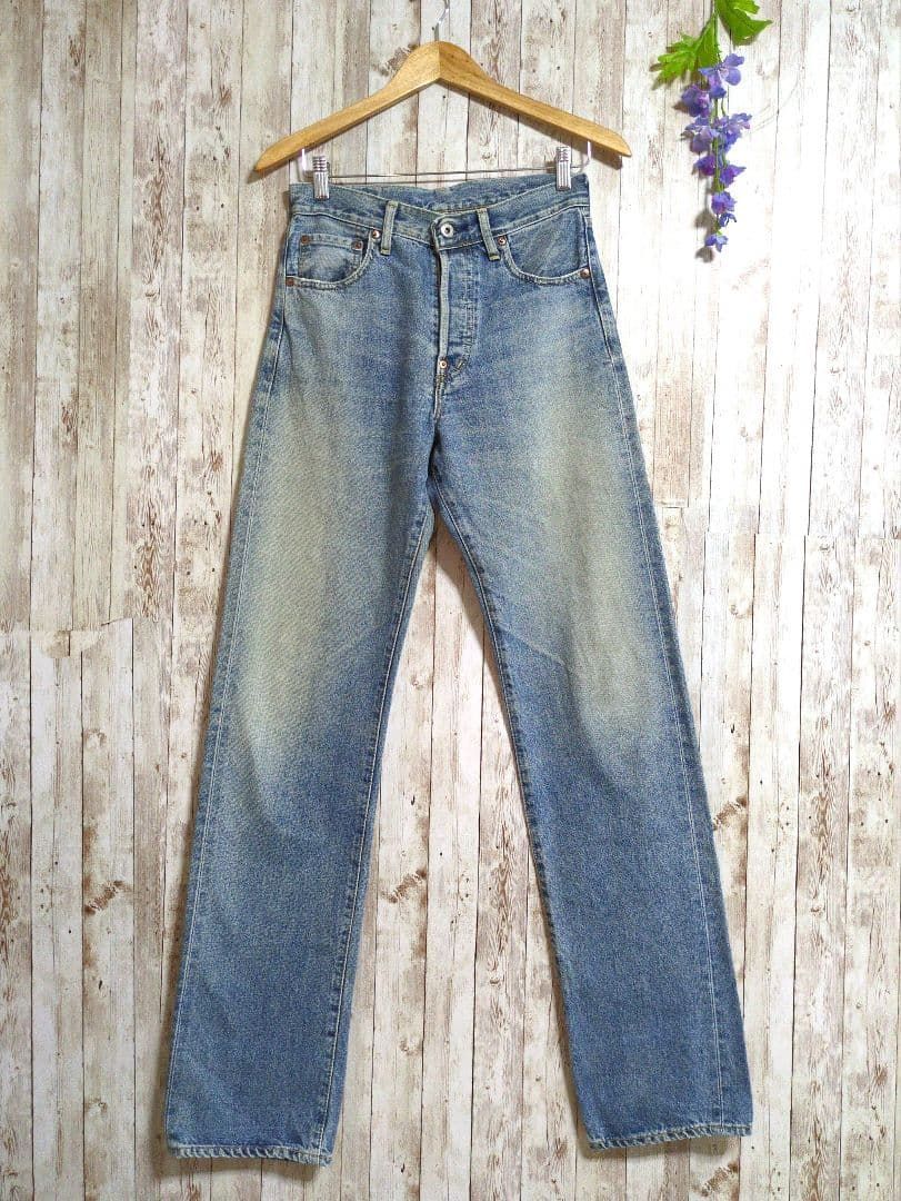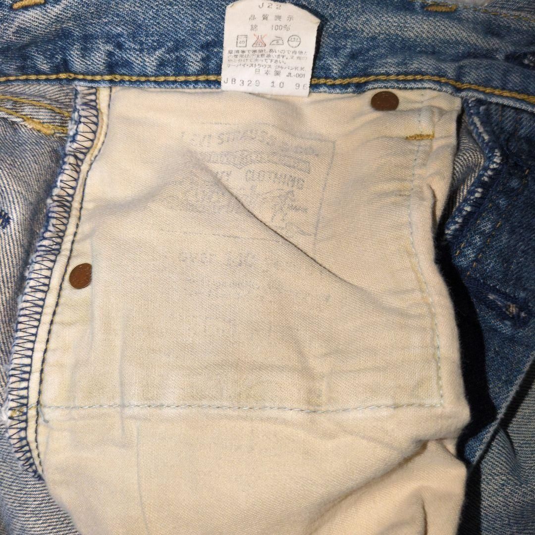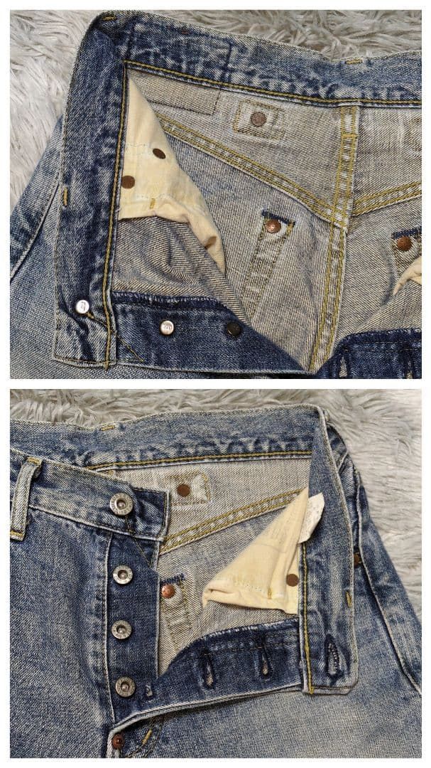 ボタンフライ、Vステッチ、股下リベット、隠しリベット、シンチバック、ビッグE、赤タブ、ボタン裏J22、セルビッチ、赤耳、チェーンステッチ、日本製、96年製、90年代ヴィンテージ