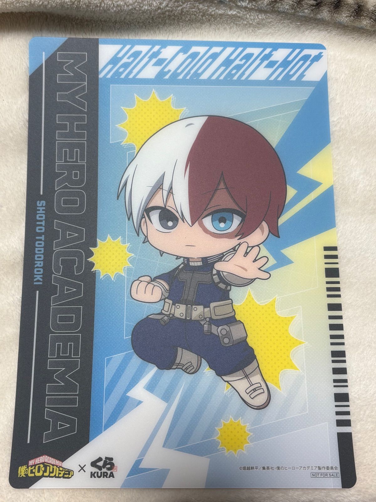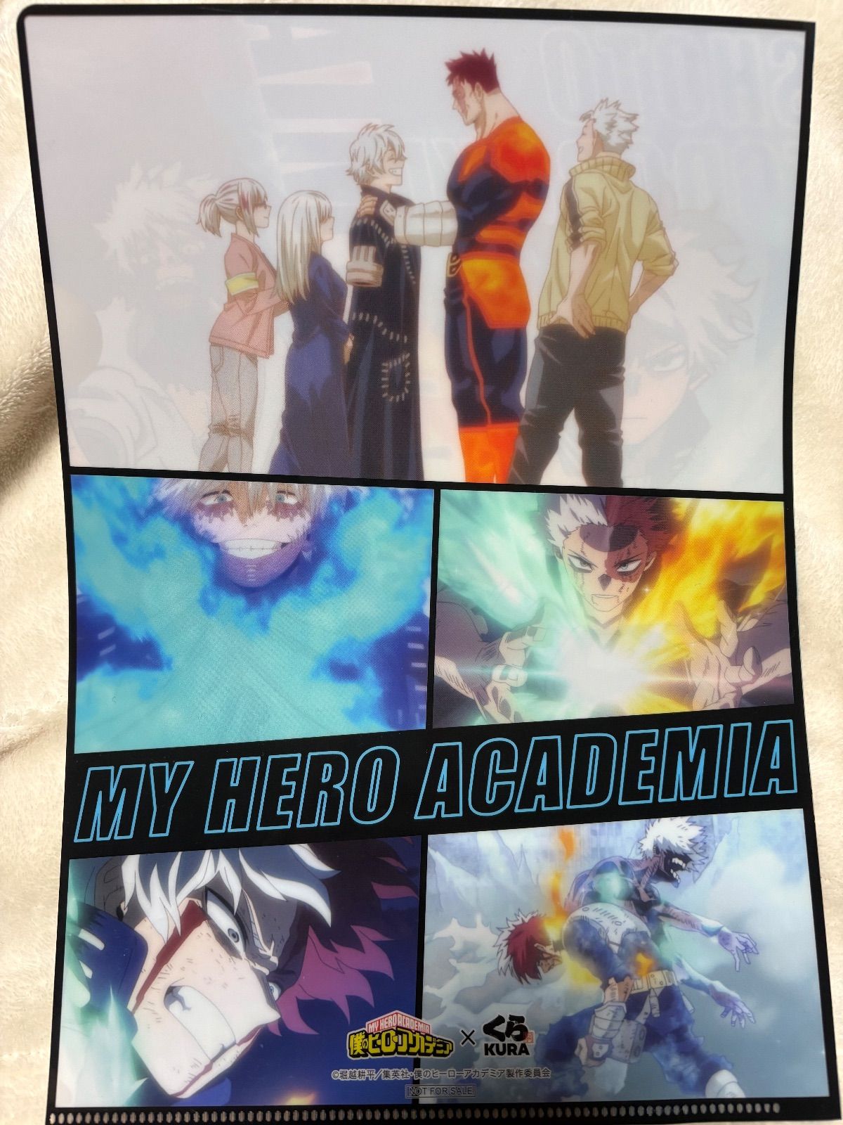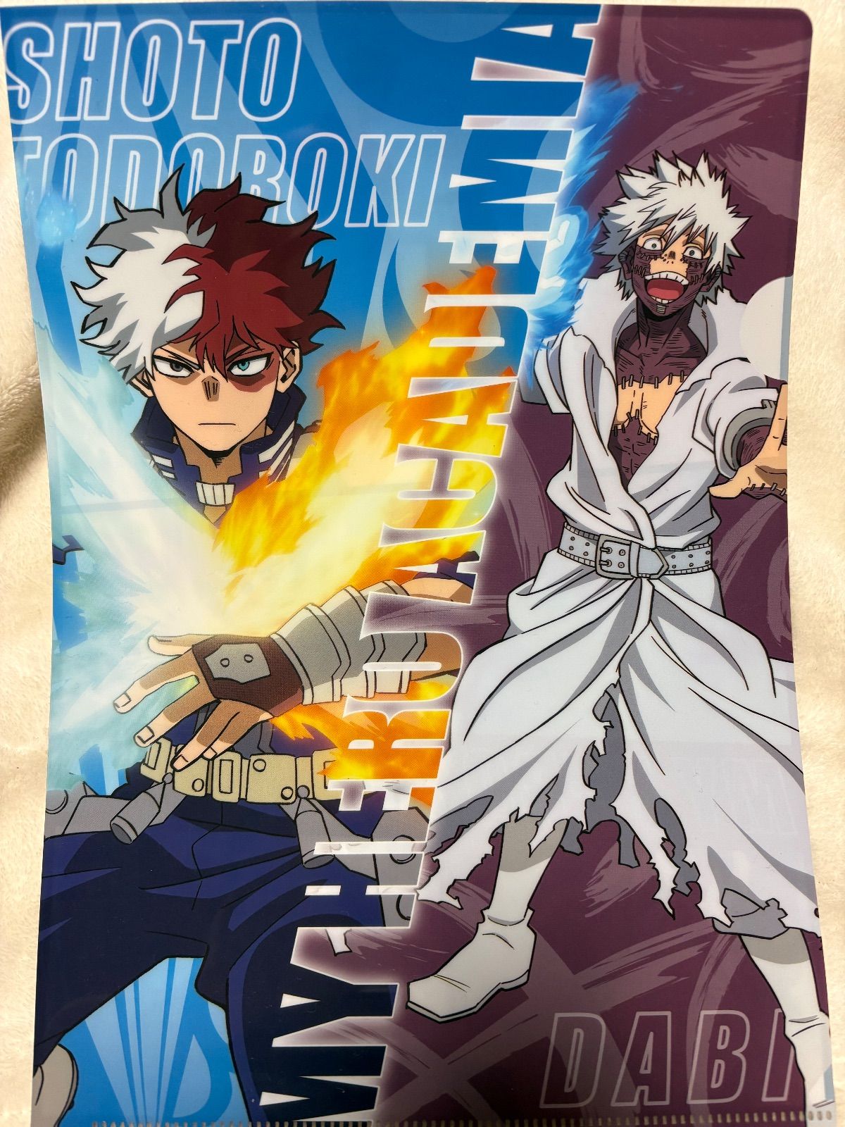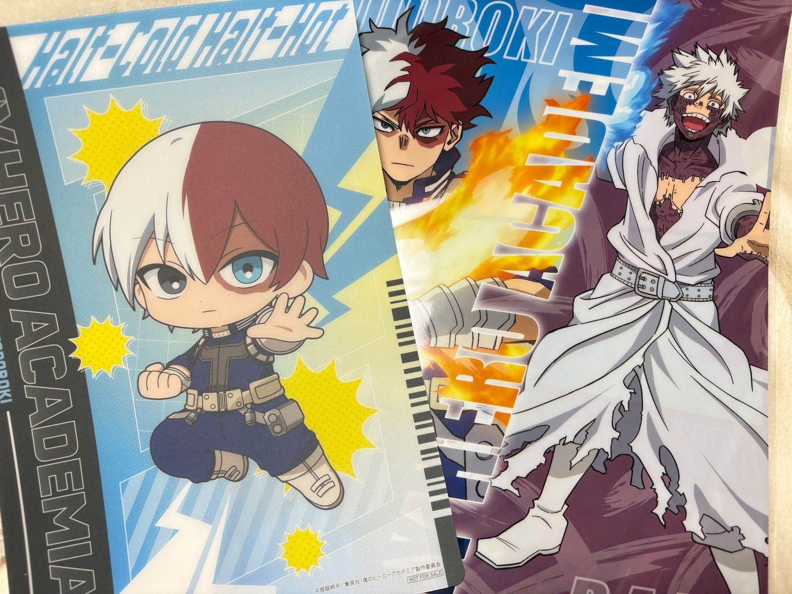 マルチシートは轟焦凍ソロのもので、クリアファイルは、轟焦凍と荼毘のデザインのものです。