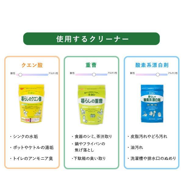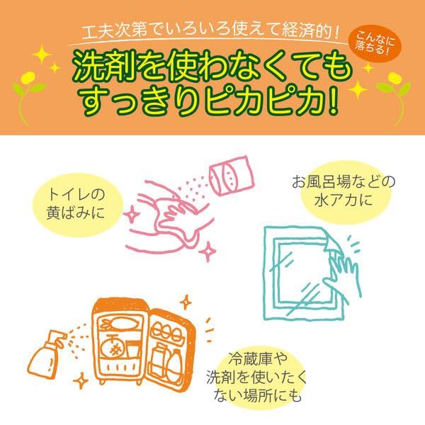 カリ性の汚れに効能的キッチンまわり、洗面 所、バスルームなどの石けん関連の汚れやトイ レの黄ばみ落としなどにおすすめです