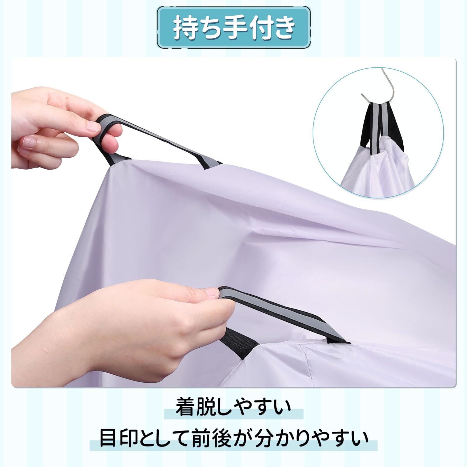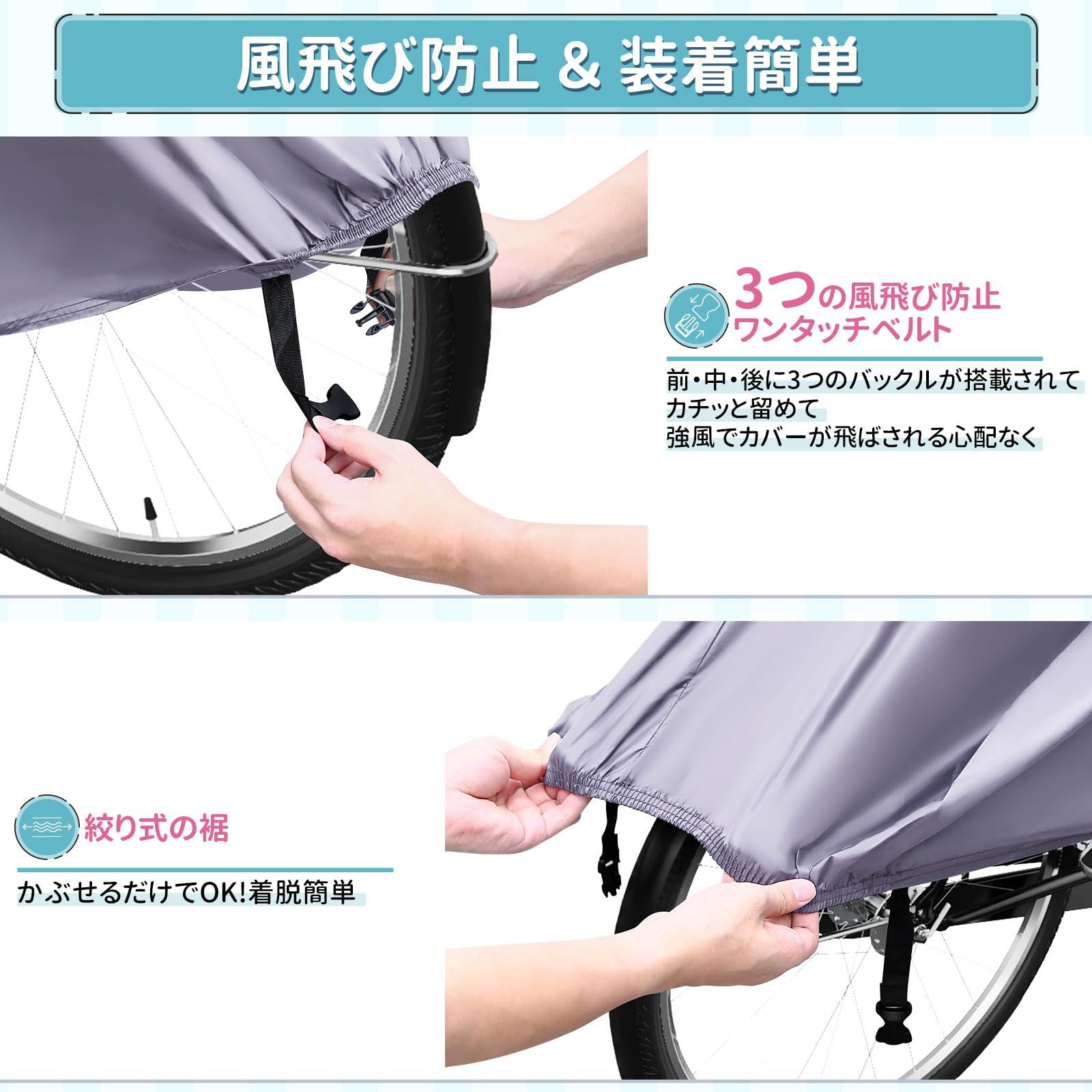 【防風×掛けやすい】前中後の3カ所に風飛び防止のワンタッチベルト付き、台風・強風でも飛ばされない!裾部分に絞りゴムが搭載されて、立体裁断なので、自転車にピッタリフィットできます。