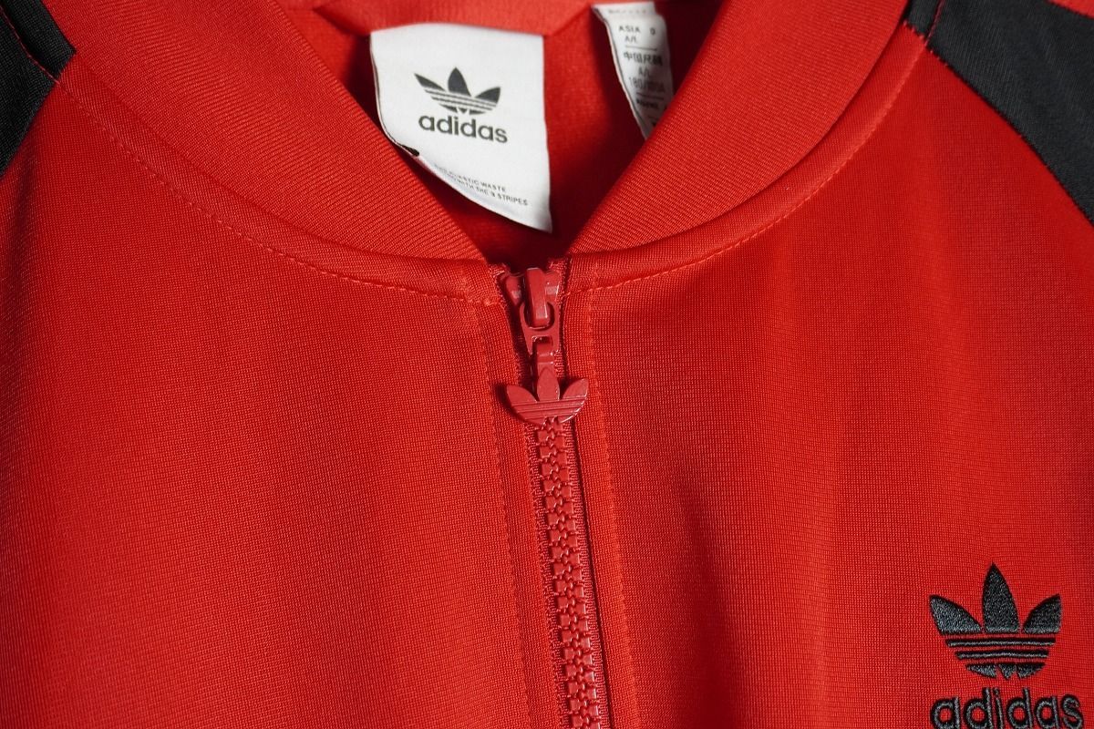 シグネチャーのスリーストライプスを袖に、トレフォイルの刺しゅうを胸に施した、定番のデザインです。