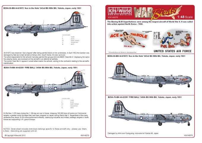 キッツワールド KW148076 1/48 アメリカ陸軍 B-29 スーパーフォートレス用デカール 第98爆撃飛行群 第343爆撃飛行隊/第98爆撃飛行群 第345爆撃飛行隊.