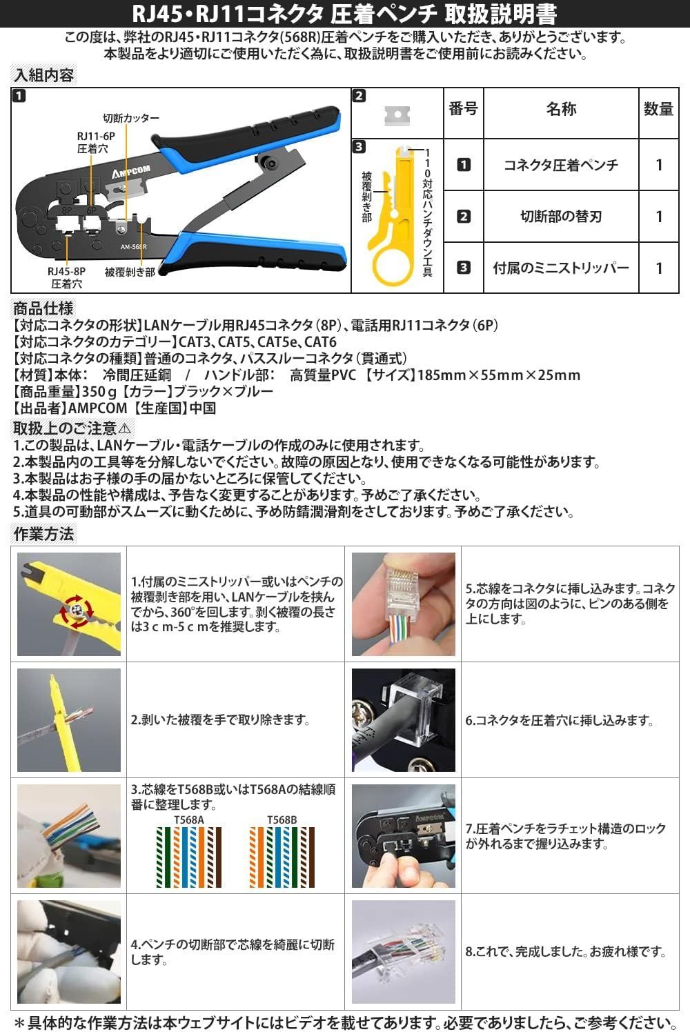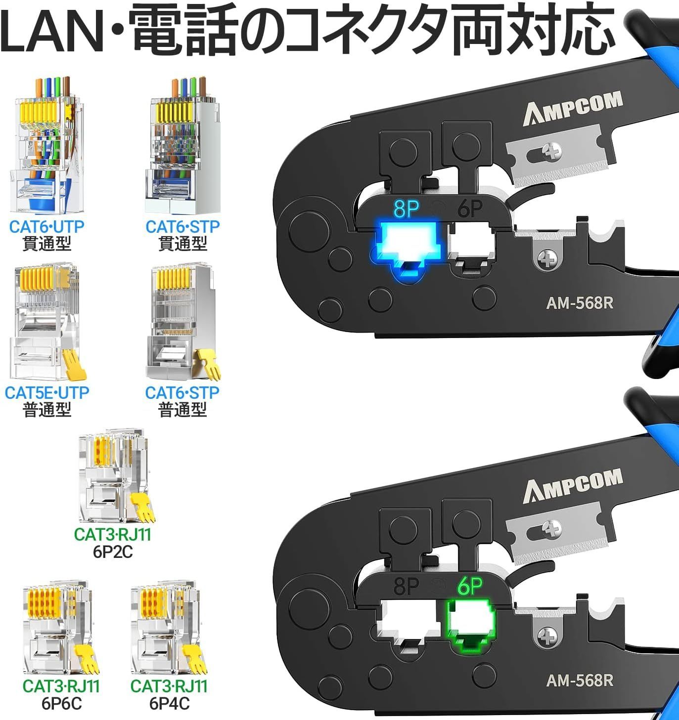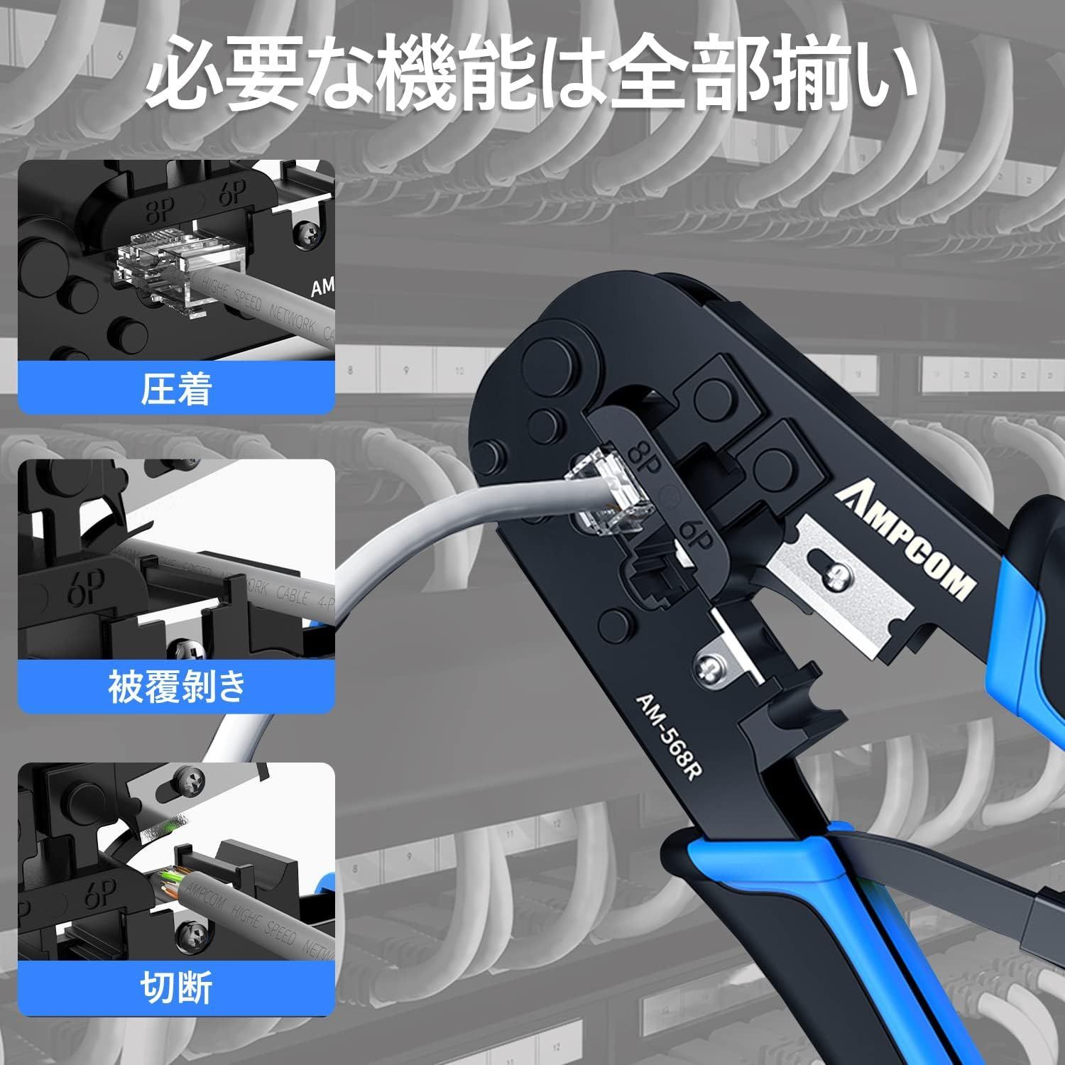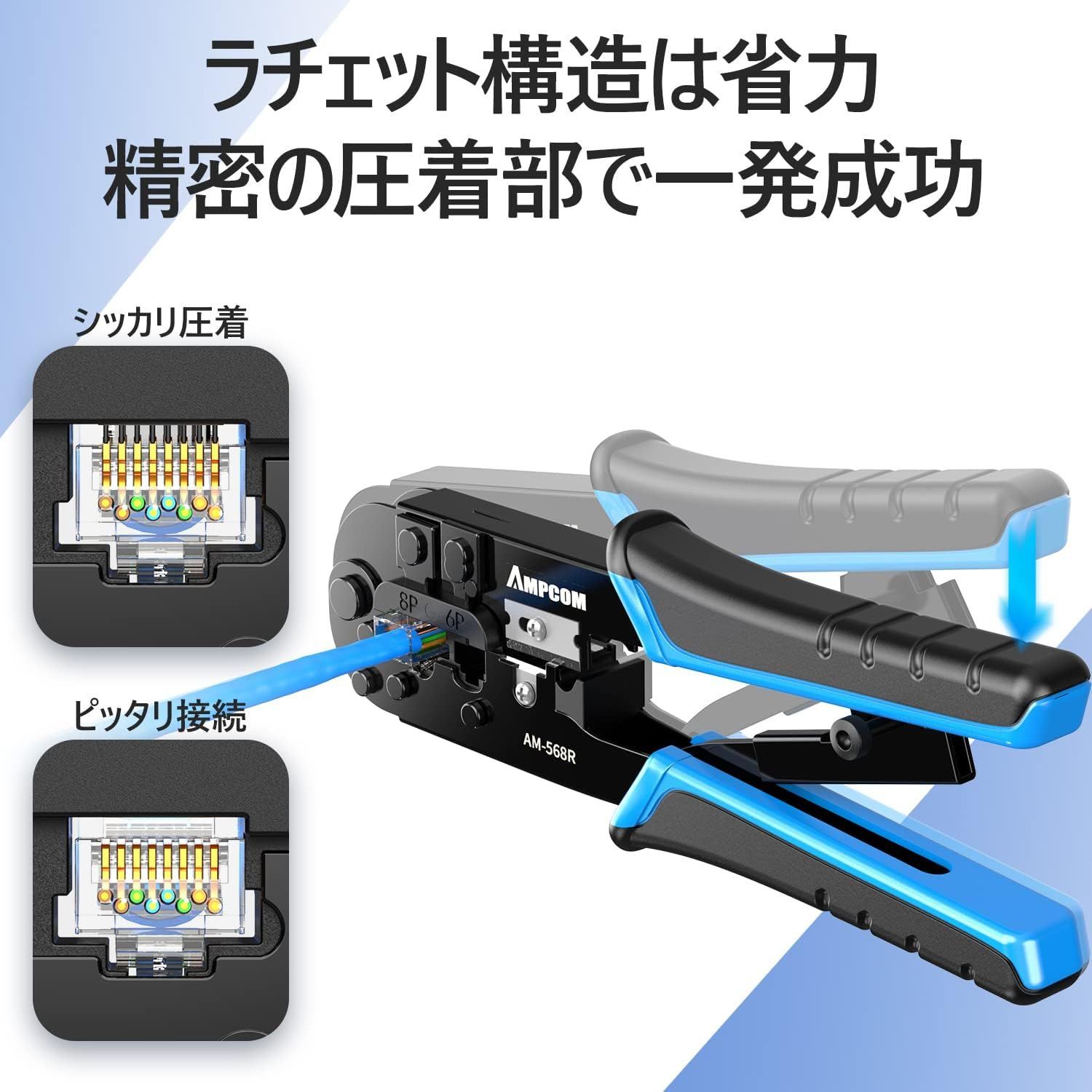 RJ45 圧着工具 LANコネクタ かしめ工具 RJ11/RJ45 6P/8Pに対応 【AMPCOM】 RJ45プラグ 圧着ペンチ ラチェットタイプ lanプラグ圧着 カット、ストリップ、クリンプ多機能圧着工具