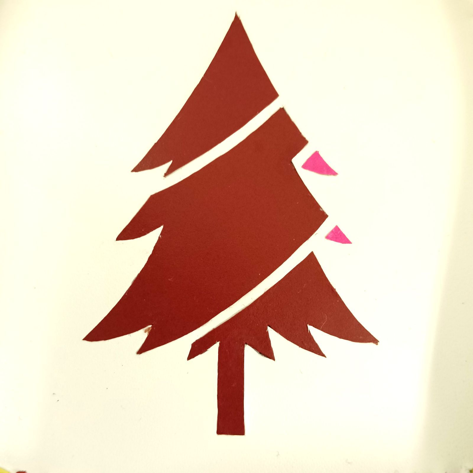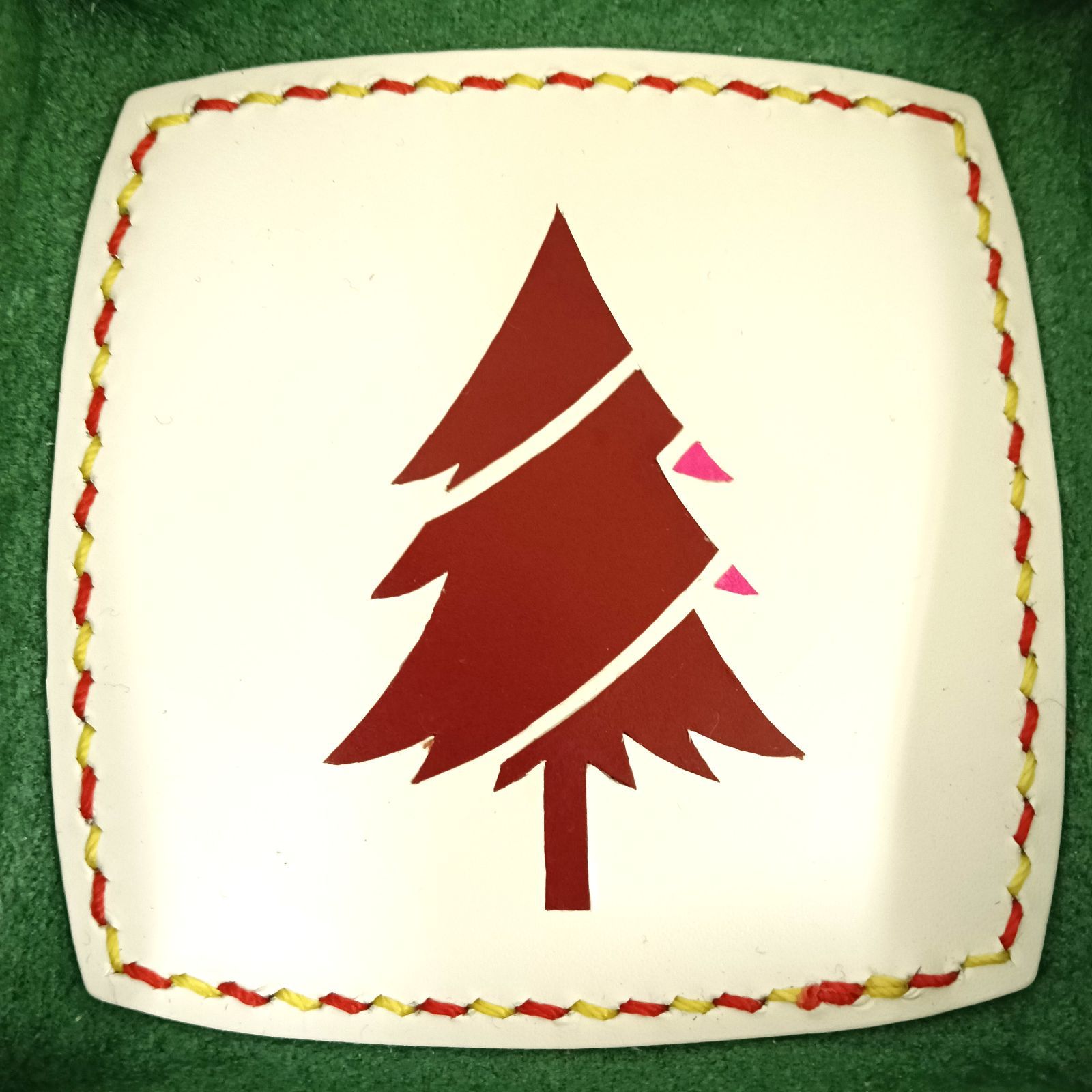 クリスマスツリーの形に切り抜き、違う色の革を同じ形に切り取った手の込んでいる作品です。