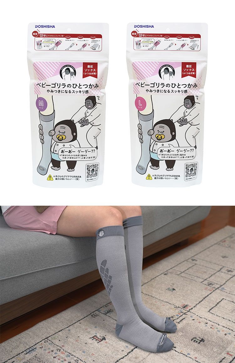 本製品は、しっかりとした圧の強さがありながらも苦しくなく快適に着用できる点や、当社のふくらはぎケア家電「ゴリラのひとつかみ」とのW使いでスッキリ感がUPするといった点から、「ゴリラのひとつかみ」の親子設定としてベビーゴリラのキャラクターをモチーフにしています。