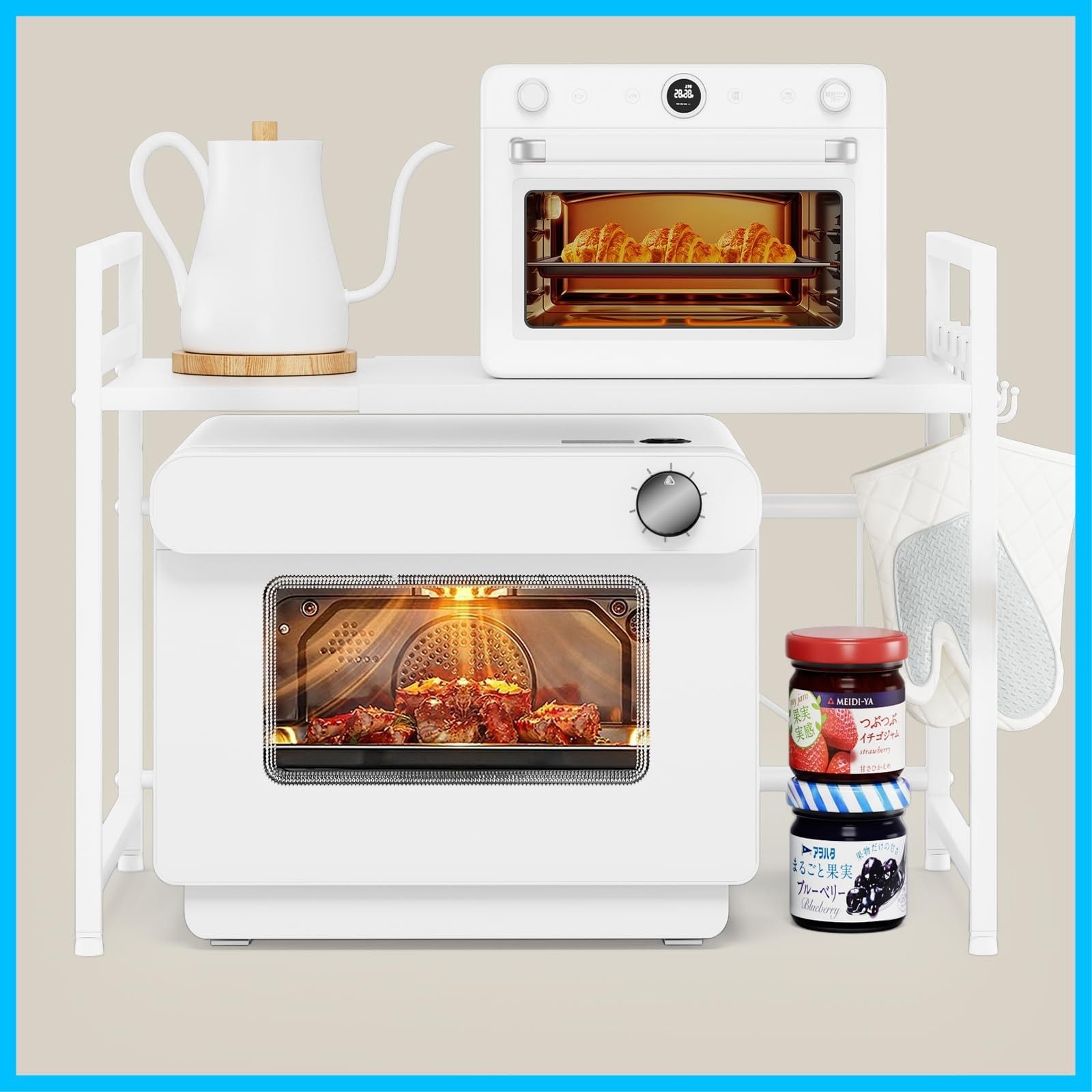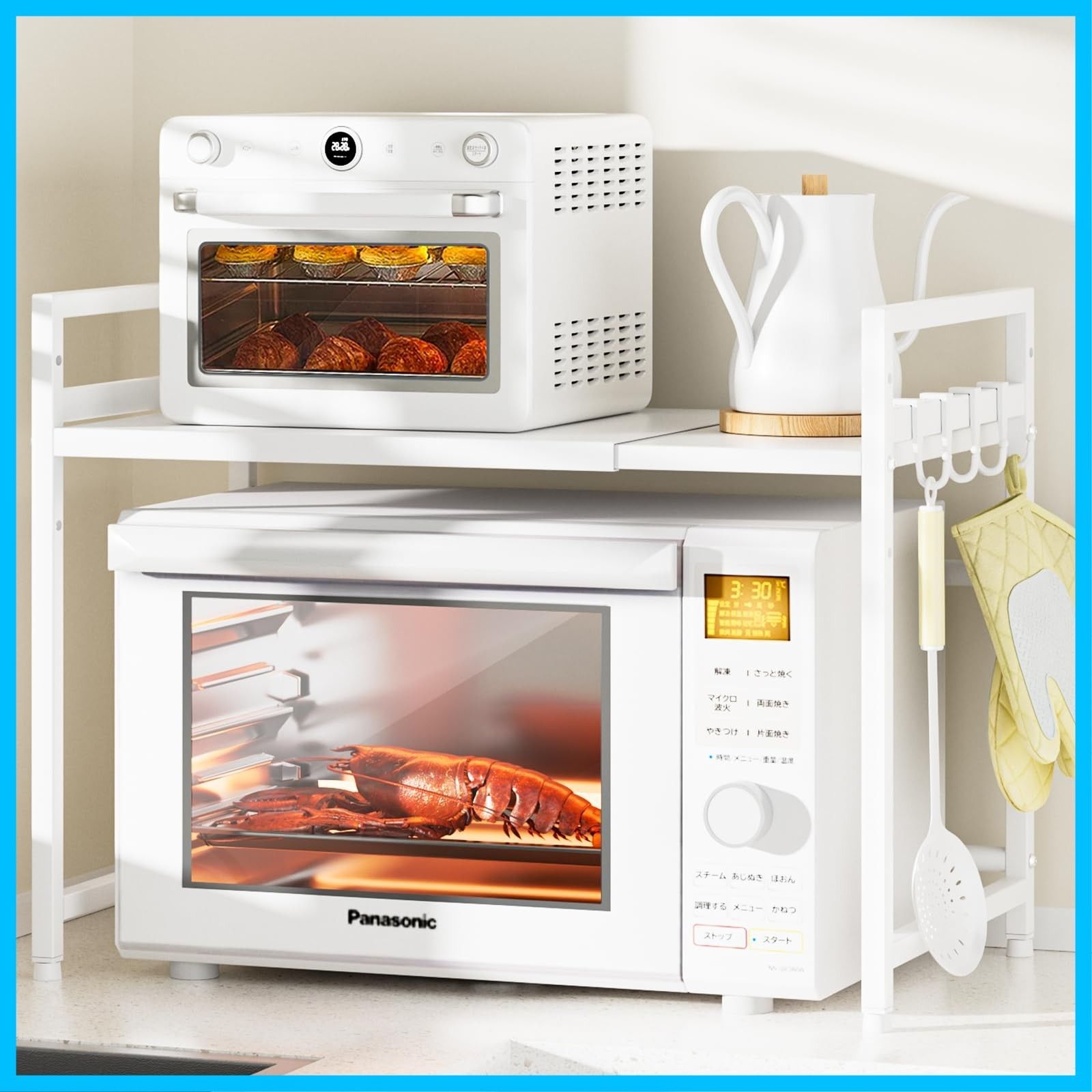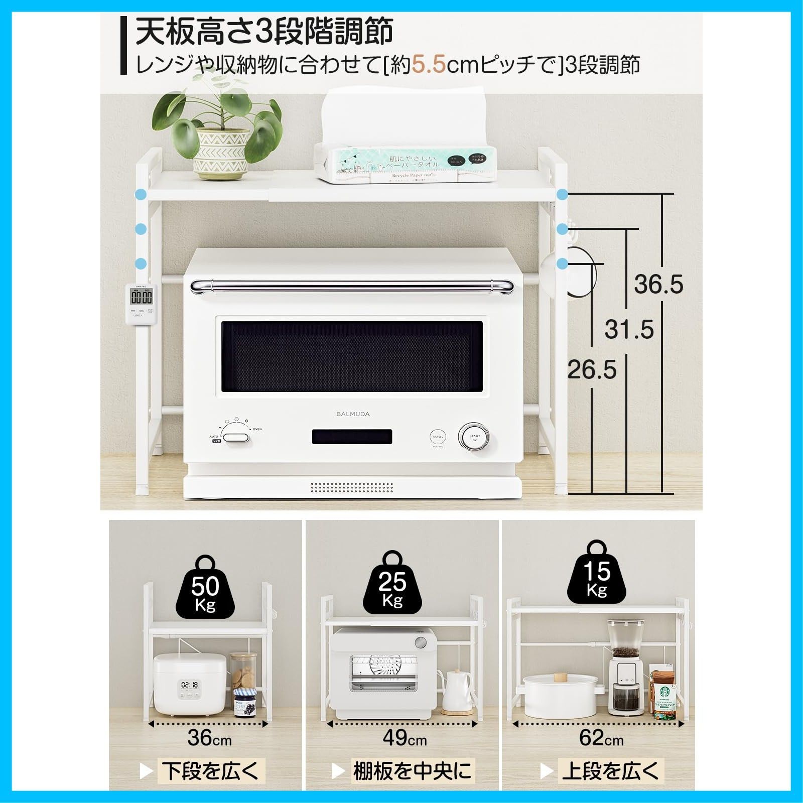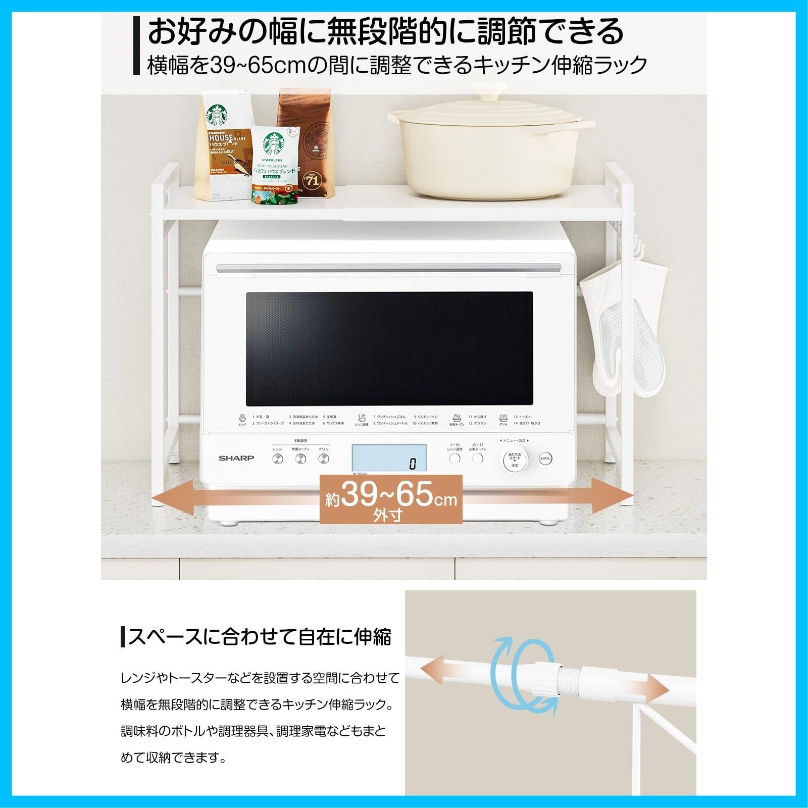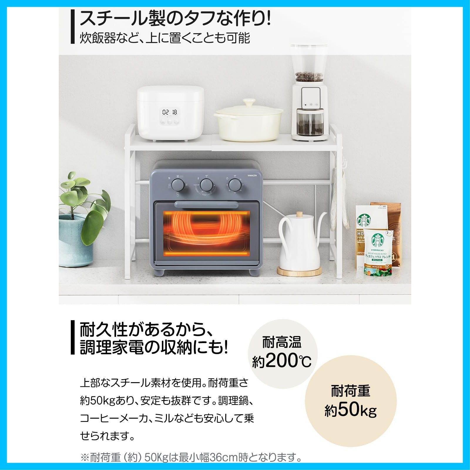 DAIWIN レンジ上ラック トースターラック レンジラック 伸縮式 幅(36~65cm) 棚板高さ調節可 耐荷重50kg シンク上キッチン収納ラック フック4個付き (ホワイト)