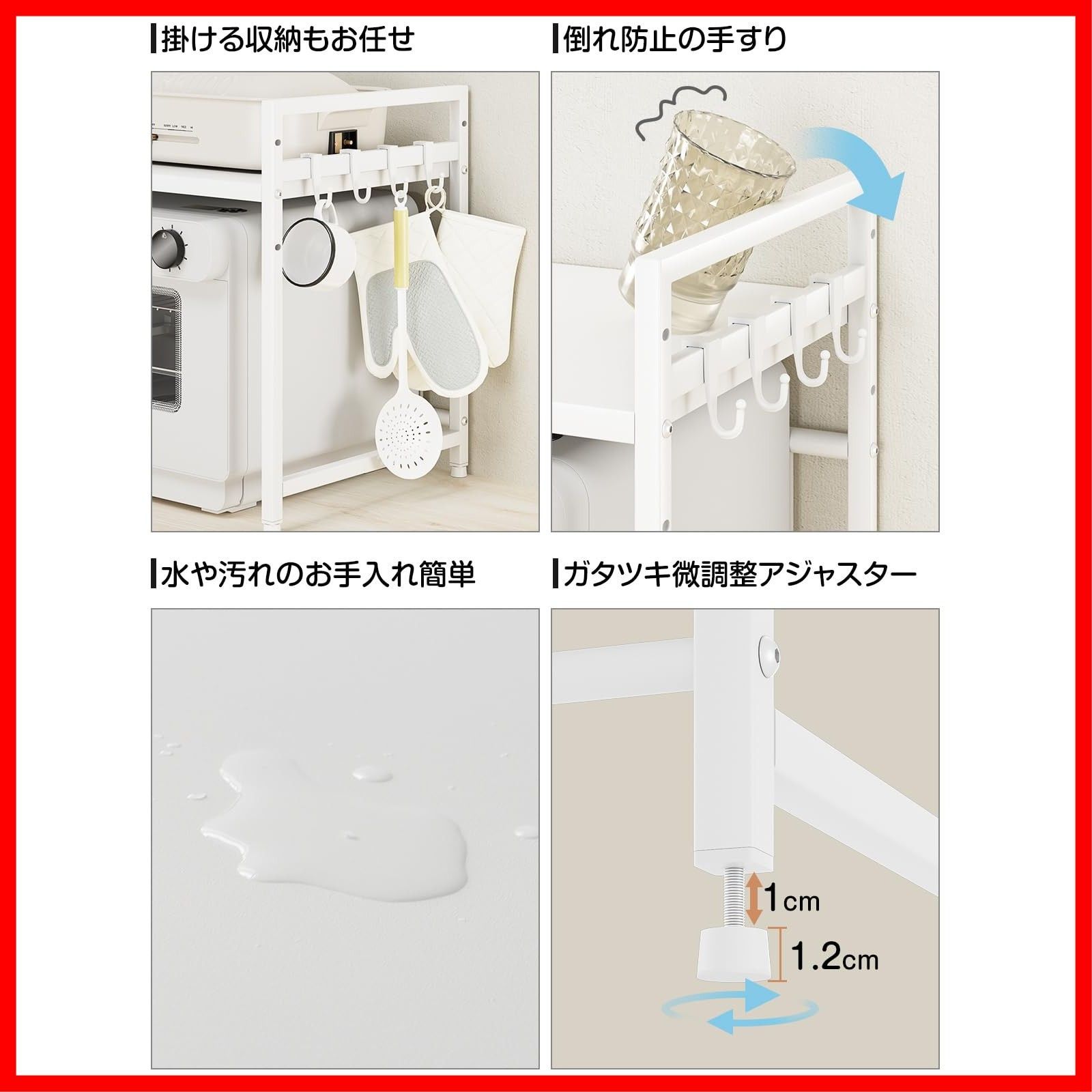 丈夫で揺れない、安定感をアップ:脚部の接地面には、高さの微調整でガタつきを抑える、アジャスターをお付けしていますから、平らではないところにも、そのアジャスターを少し調整したら、棚が揺れません。上層の両側は落下防止のフレーム付き、置物倒れ防止可能です。