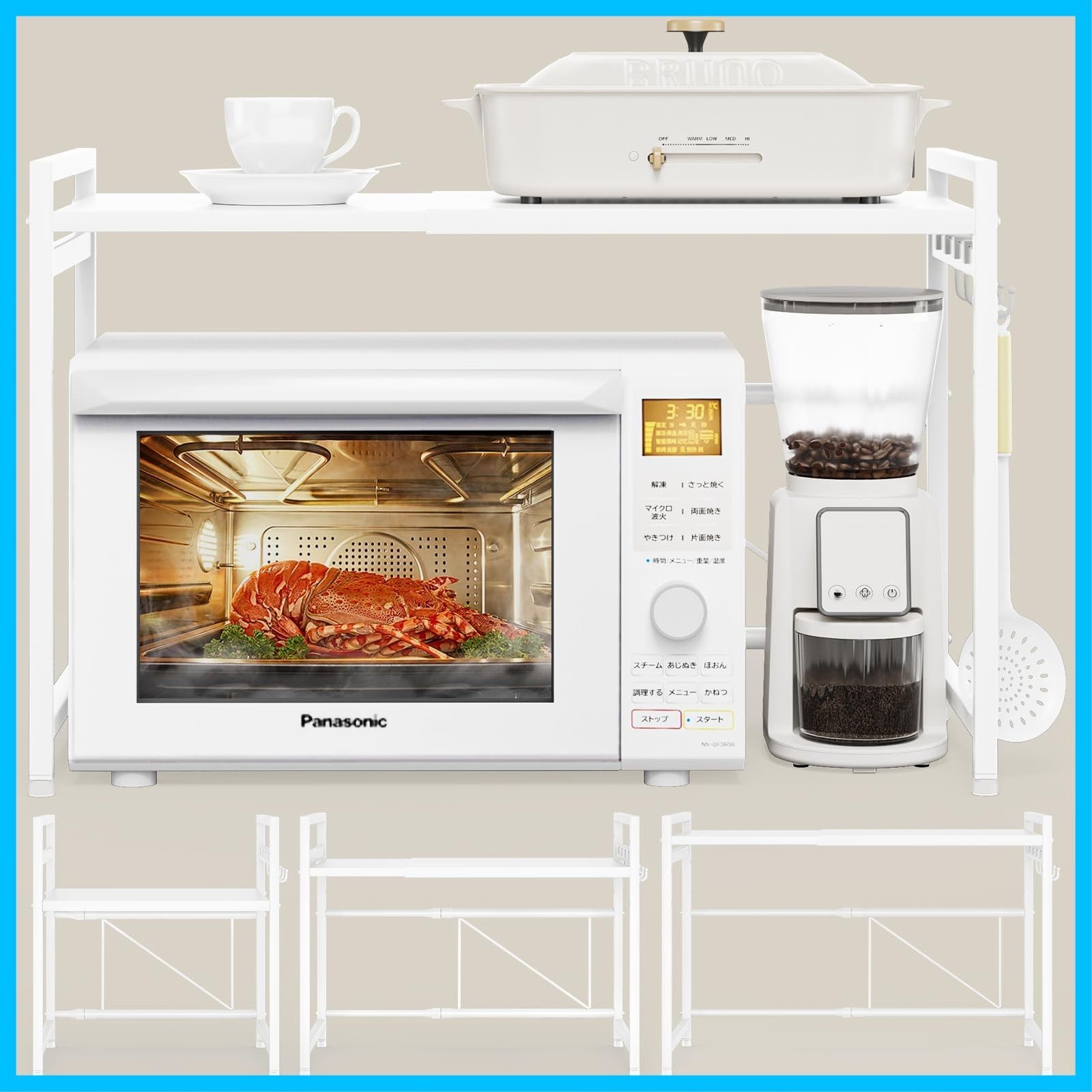 電子レンジ上のデッドスペースを有効活用できる伸縮キッチンラック:レンジ上ラックは、約幅36cm~65 cm(内寸)で無段階調整できる、可動棚板は約5.5cm間隔で3段階で高さ調節可能です。レンジの大きさや収納物の量、置く場所の広さなどに合わせたご家庭のキッチンにちょうどいい形で設置していただけます。サイドバーを4個s字フックなどを使用した吊り下げ収納に使えます。レンジラックとして使えるし、洗面台の下の棚としても使える、リビングでも使えます。オーブンレンジラックは黒、白、ブルー、グリーンの4カラーがあります。