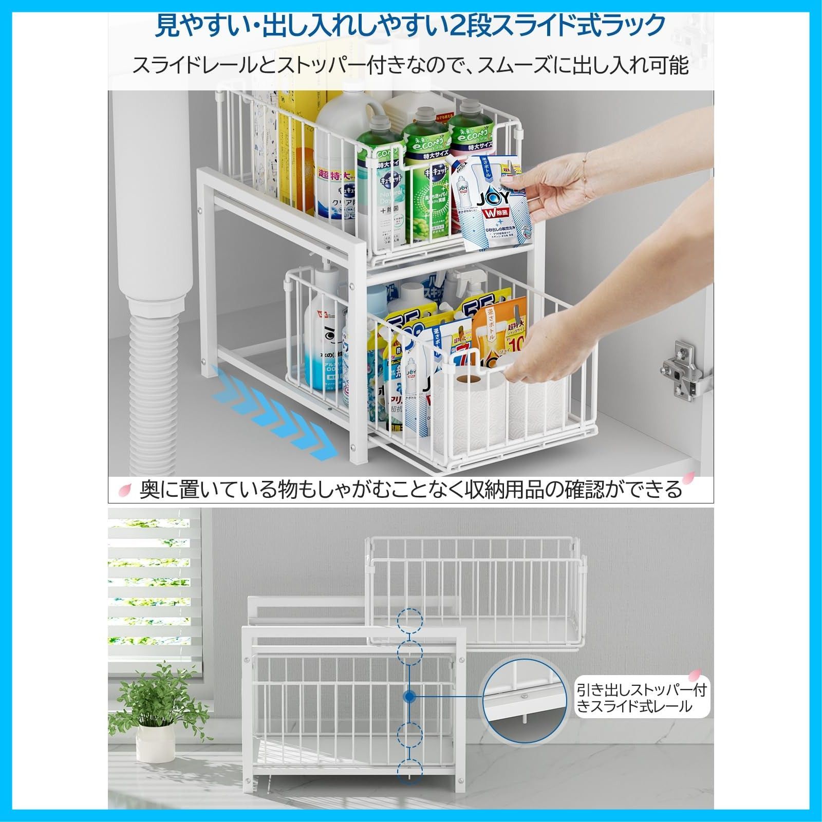 ラクラクスライドで、シンク下の奥まで有効活用:2段スライドラックは細かなキッチンツール、食品・ラップ・ホイルなどのストック品をシンク下空間利用して効率よく収納可能です。スライド式でスーッと引き出しが手前にスライドするから、取り出しやすく、片付けやすい。