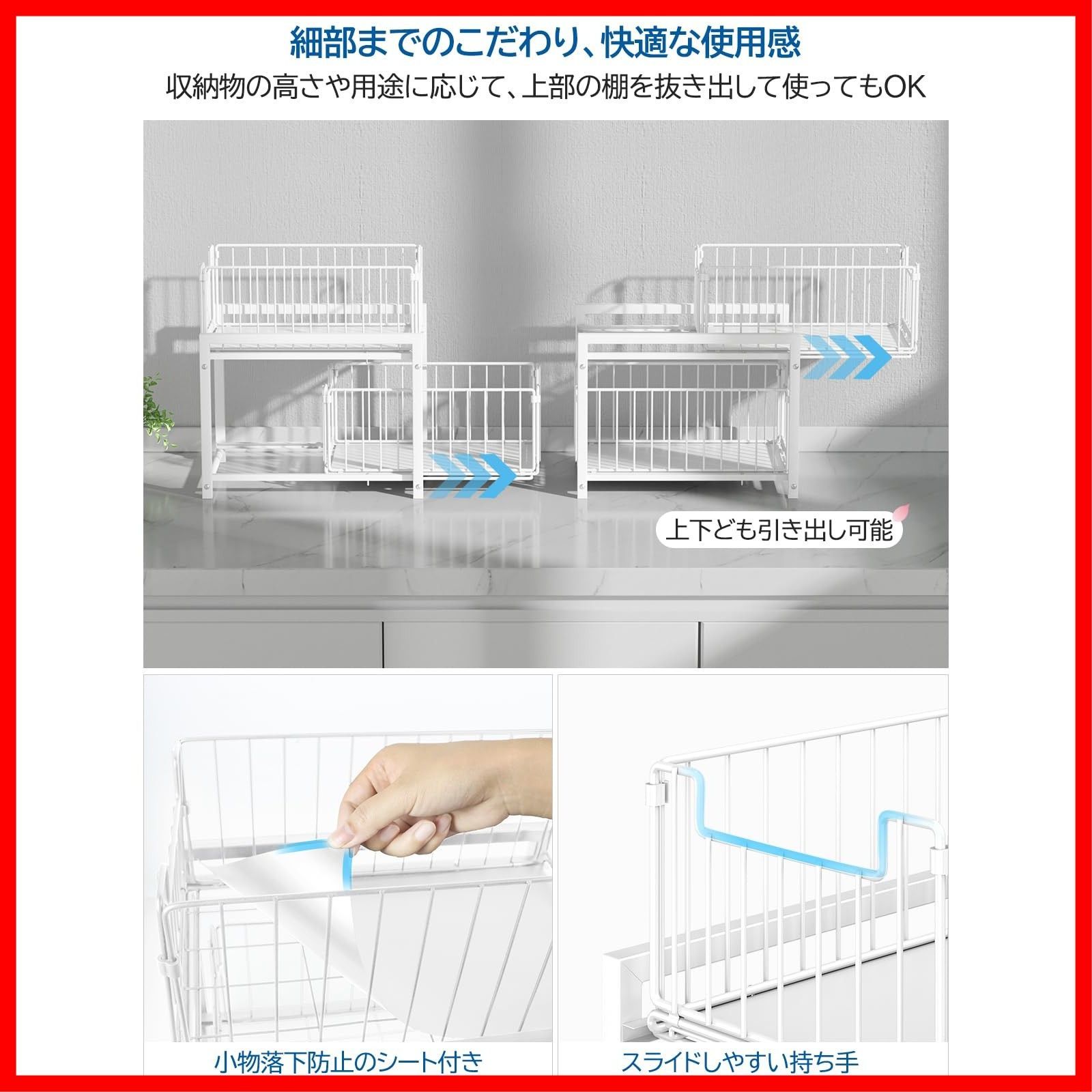 安心のストッパ付き:改良版シンク下収納ラックはストッパー付きで抜け落ちがありません。物を載せた状態でもしっかり止まることができます。洗面台やシンクの下がすっきり片付くスライド式の収納ラックは、耐荷重設計で耐久性のある炭素鋼で、長期間使用することができます。高温塗装技術で防水、防錆、防汚という三大特徴があります。しっかりしたキッチンラックです。備品や必需品をきちんと保管できます。
