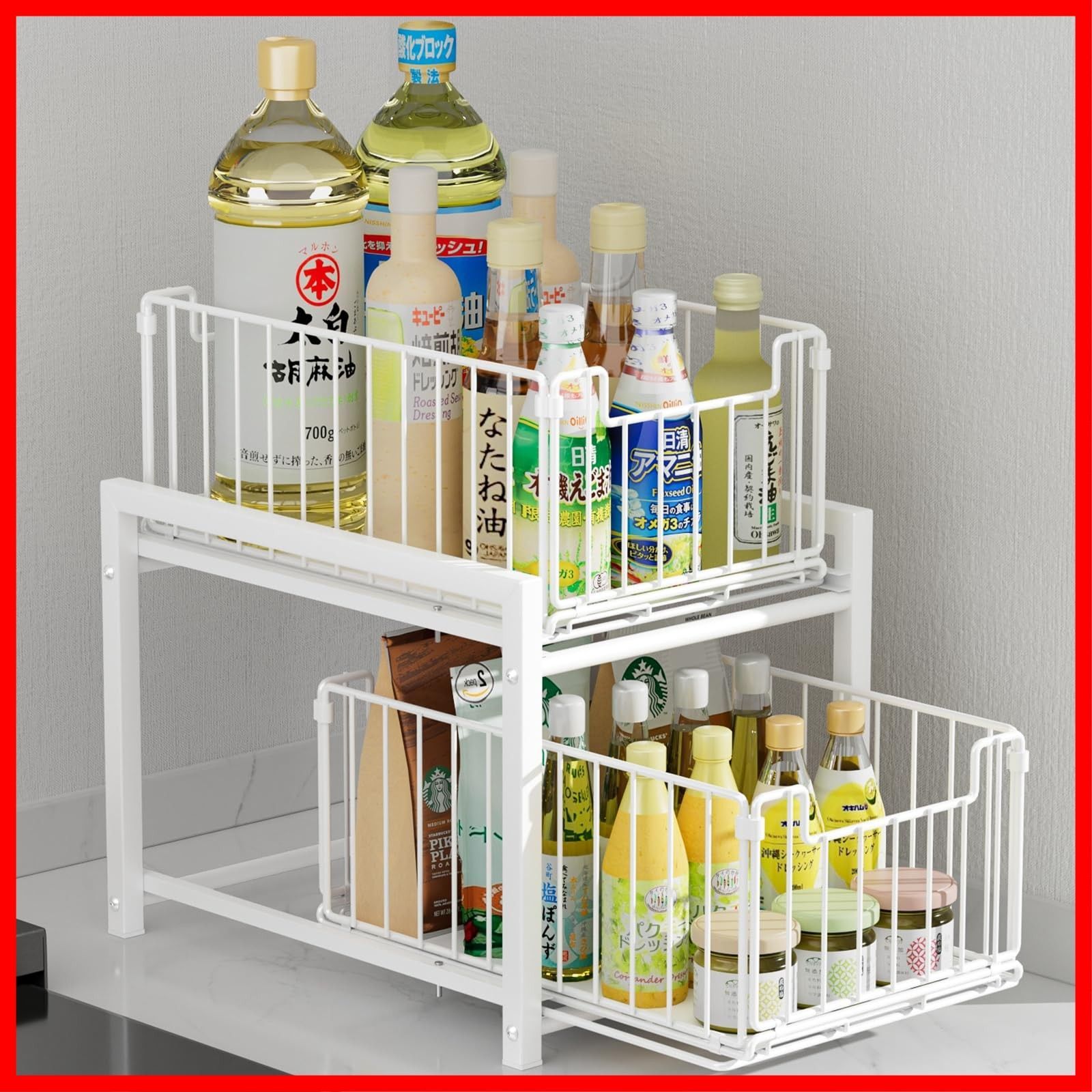 DAIWIN シンク下収納 スライドラック 棚2段 幅27 引き出し 調味料収納ラック 台所収納 大容量 キッチン収納ラック 隙間収納 組立簡単 省スペース 2段ラック 防汚 防錆 防油 (ホワイト)