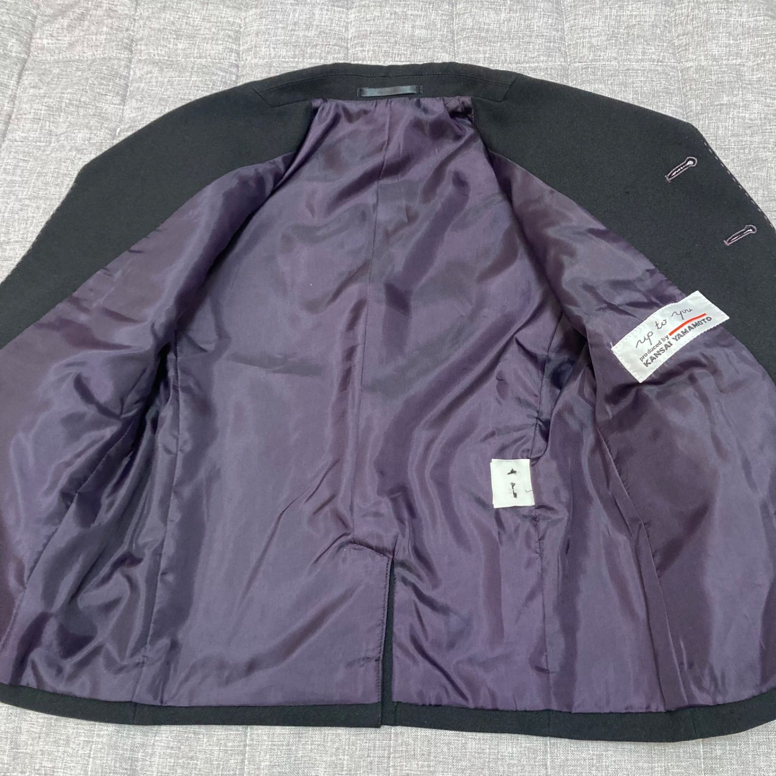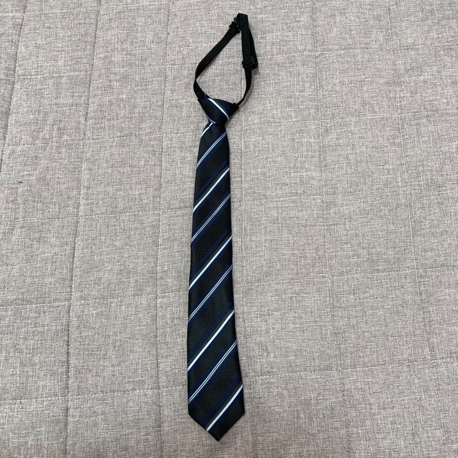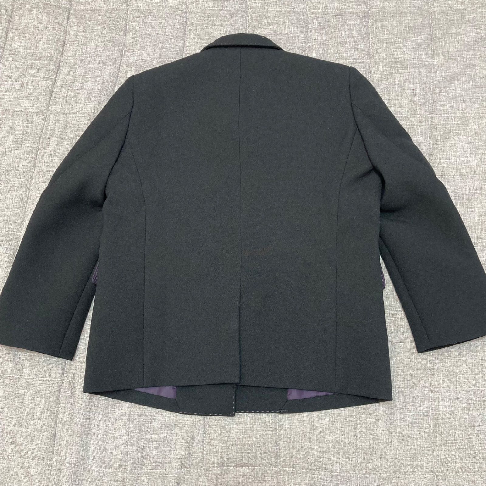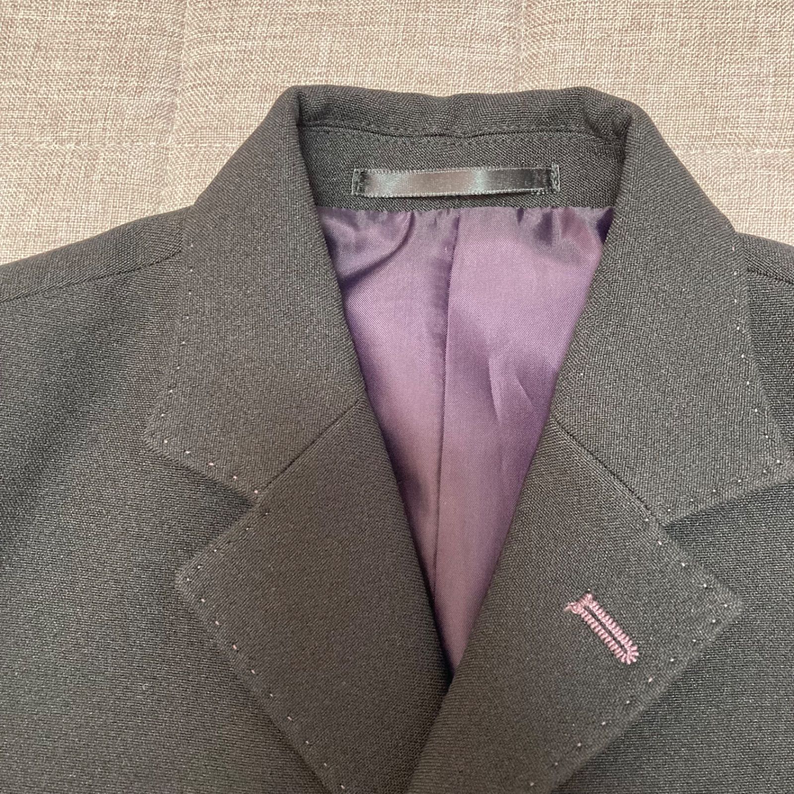 黒に紫色のステッチがオシャレなセレモニースーツです。シャツは白、ネクタイは黒に青のストライプです。
