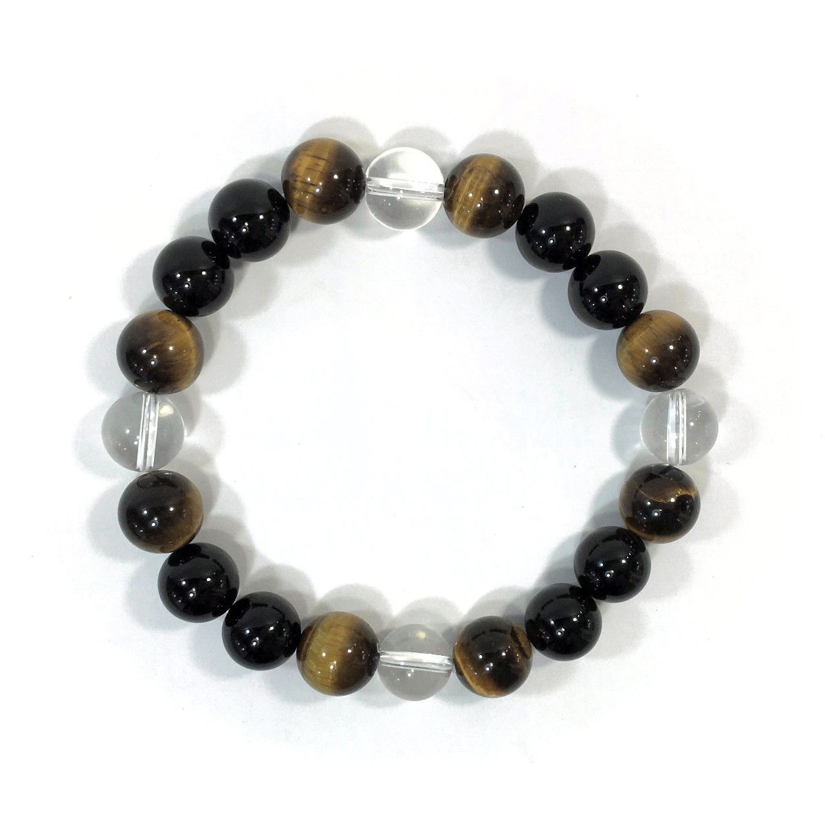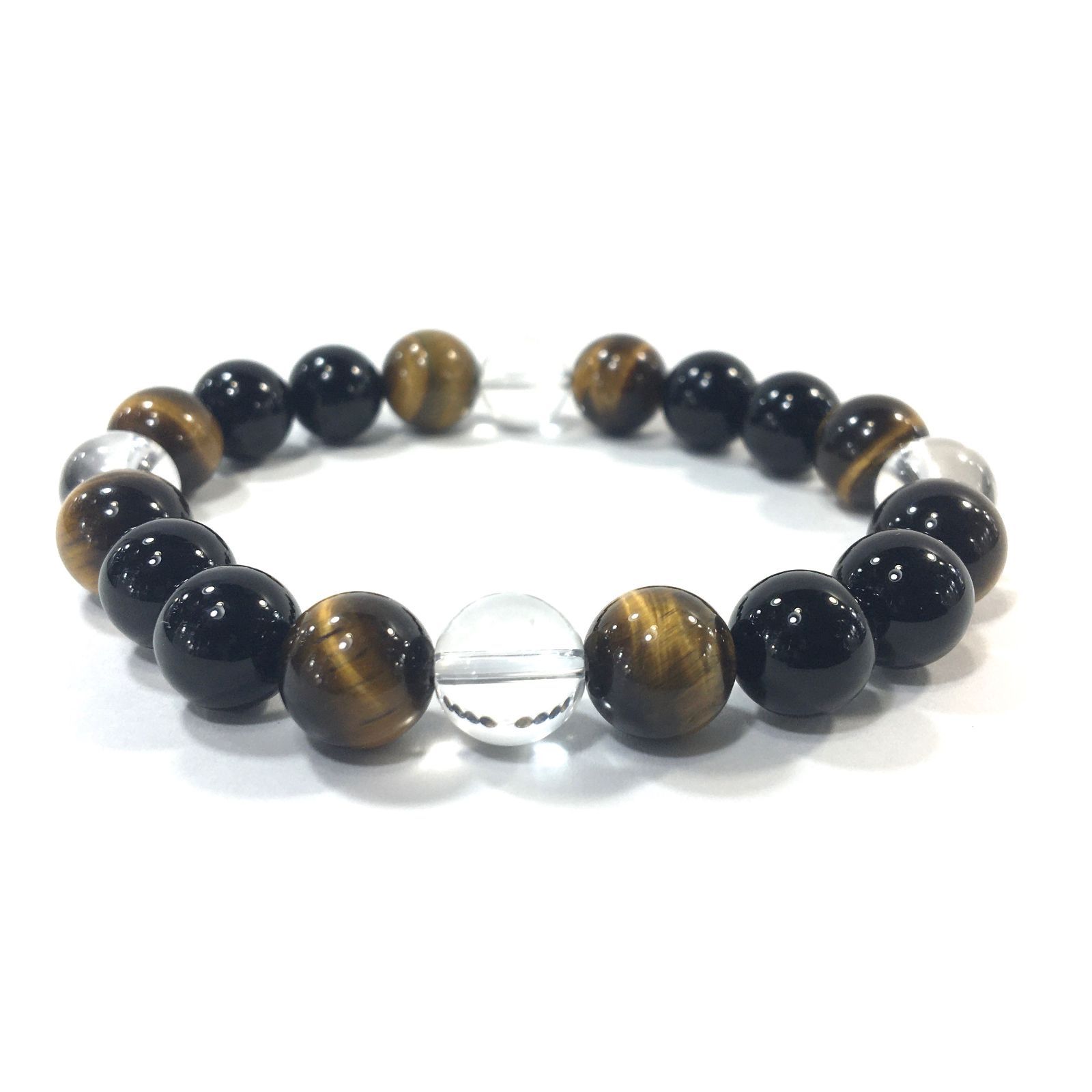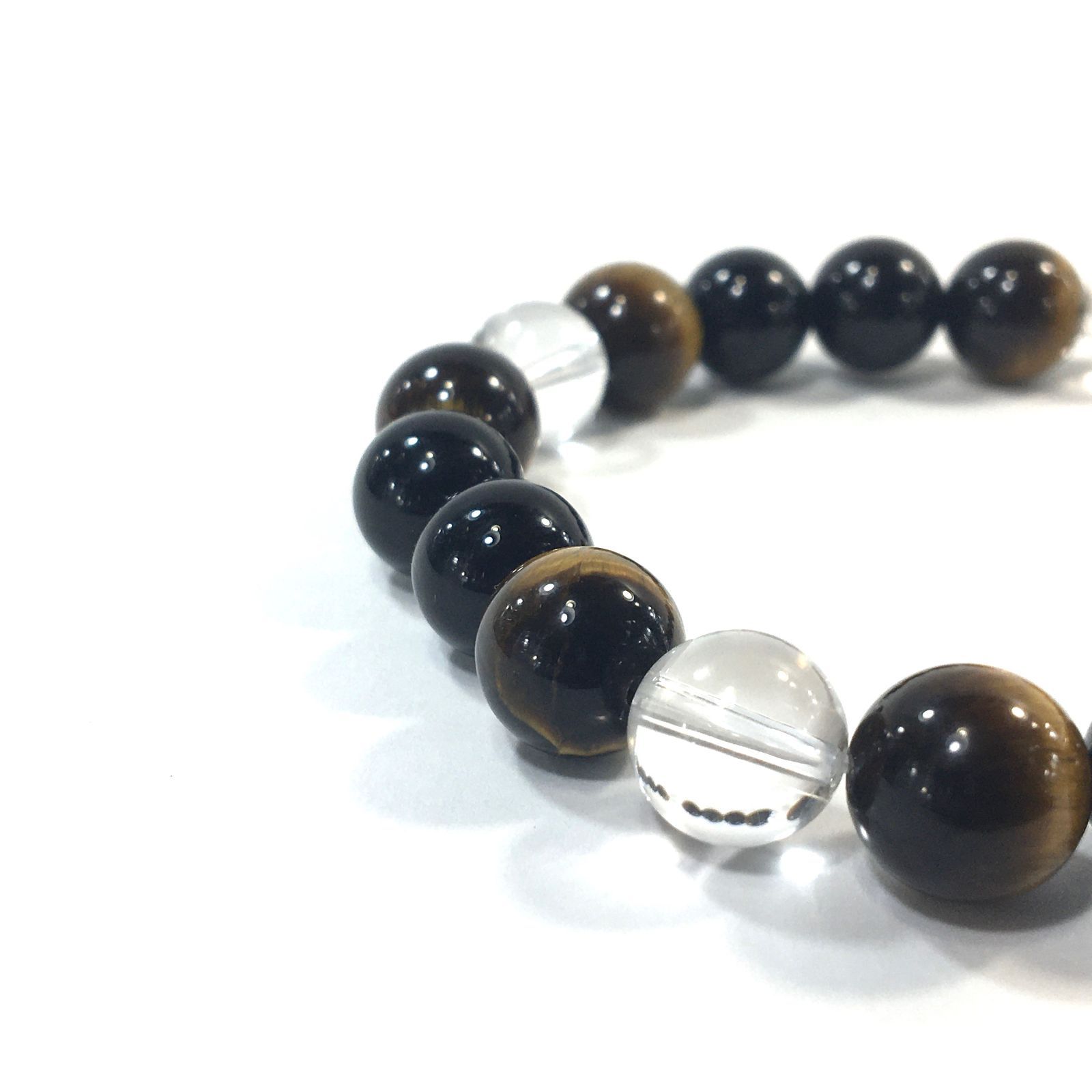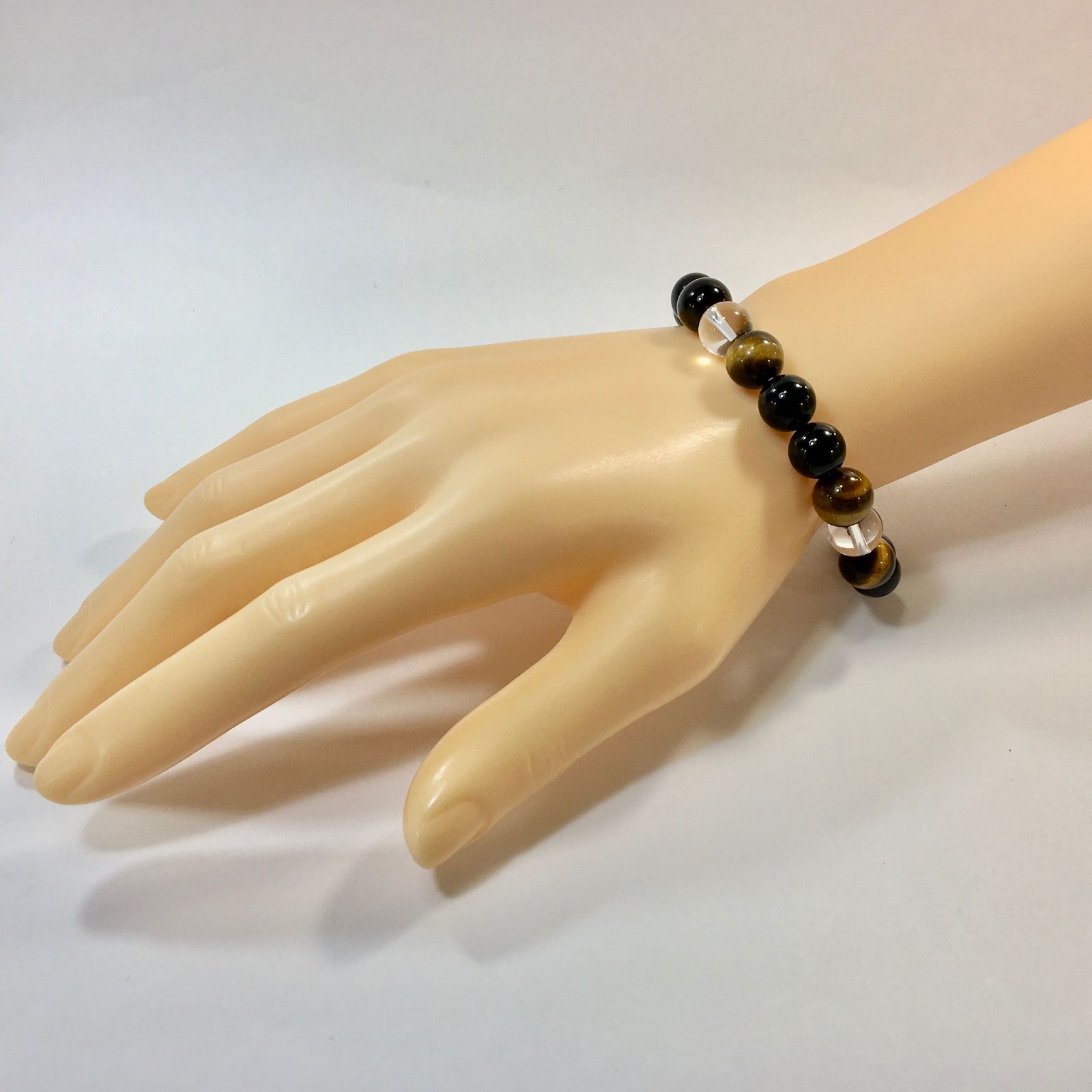 こちらは、水晶とタイガーアイとオニキス使用したパワーストーンブレスレットです。今回はパーツは使わずシンプルに石のみでデザインしてあります。パーツを使っていないので金属アレルギーの方などにもオススメできるブレスレットです。石の大きさは全て10mm玉を使用して内径約17cmです。数に限りがございますので気になる方はお早めにどうぞ。