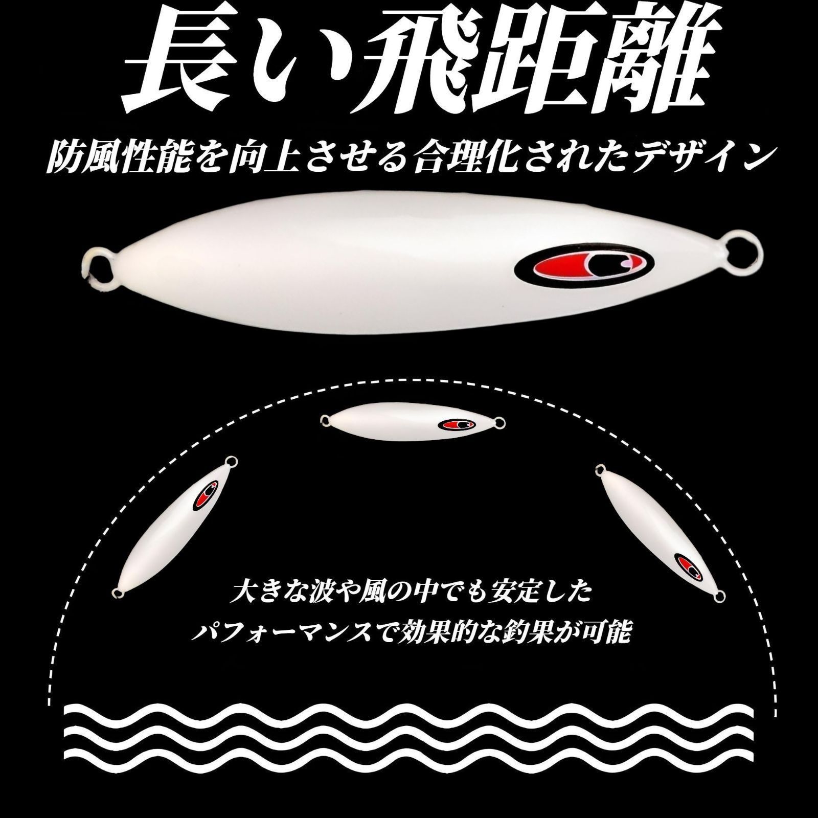 スロータイプのメタルジグは、幅広で裏表の形状が異なり、ゆっくりと平打ちしながら、じっくり魚に見せることができ、しゃくり上げると横に飛びますがロングよりは抑え気味なアクションが特徴です。