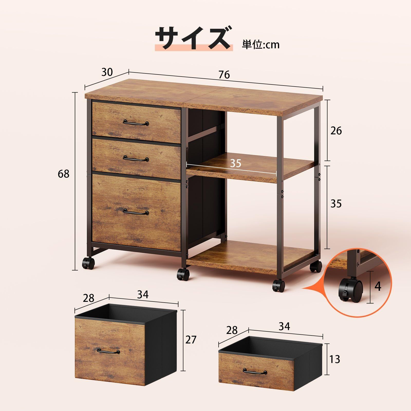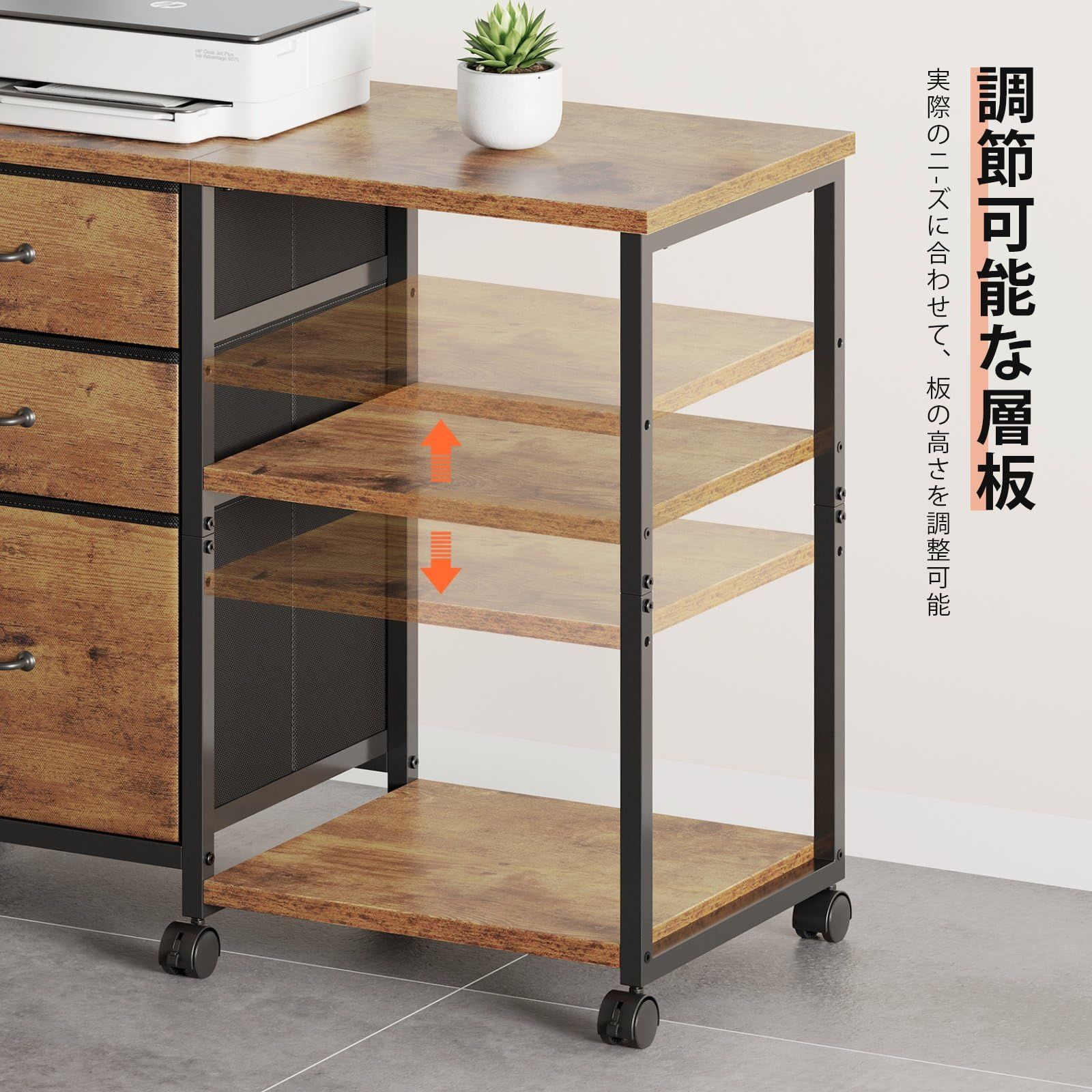 サイドキャビネット デスクワゴン 布製 袖机 層板付き サイドワゴン 3段 オフィスワゴン A4対応 プリンター台 大容量 キャスター付き デスク下収納 ビンテージ+ビンテージ