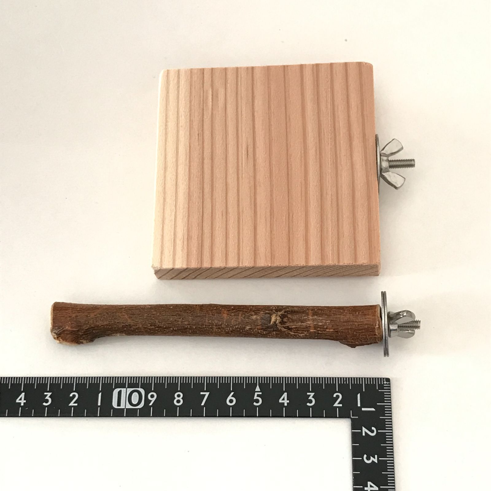 四角い止まり木は一辺が約9センチ程度、厚さは約1.4センチです。