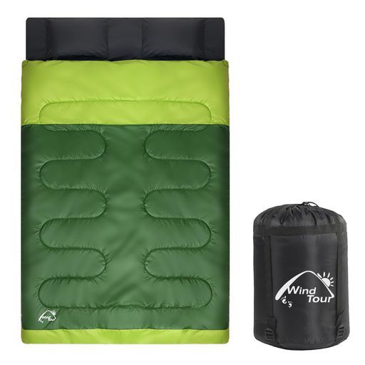 ダブル寝袋枕2個付き軽量保温防水寝袋2人用スリーピングバッグ防災用車中泊キャンプ収納パック付(グリーン-2.0kg)