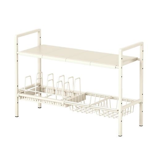 【収納ラック仕様】横幅53~88cmx奥行き25cmx高さ48.5cm、収納バスケット:26x16.5x7cm、収納ボード:25.5*16cm、鍋収納ラック:25*33*12cm;各層の高さは5cmを1段階として上下に調整でき、合計3段階。2段伸縮式ラックには、2段式ブラケットx2、伸縮チューブx4、鍋収納ラックx1、収納バスケットx2、収納ボードx4
