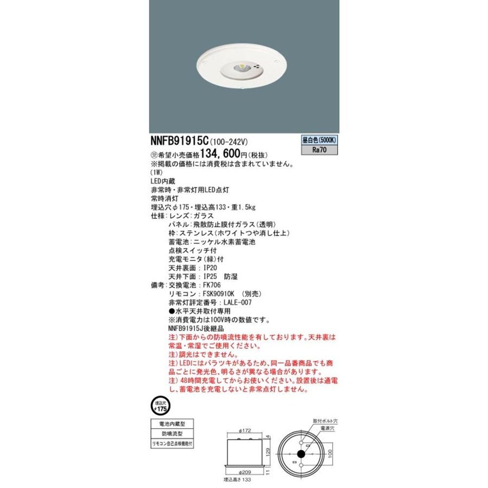 LED非常用照明 5000K リモコン自己点検機能付/埋込穴φ175 NNFB91915C