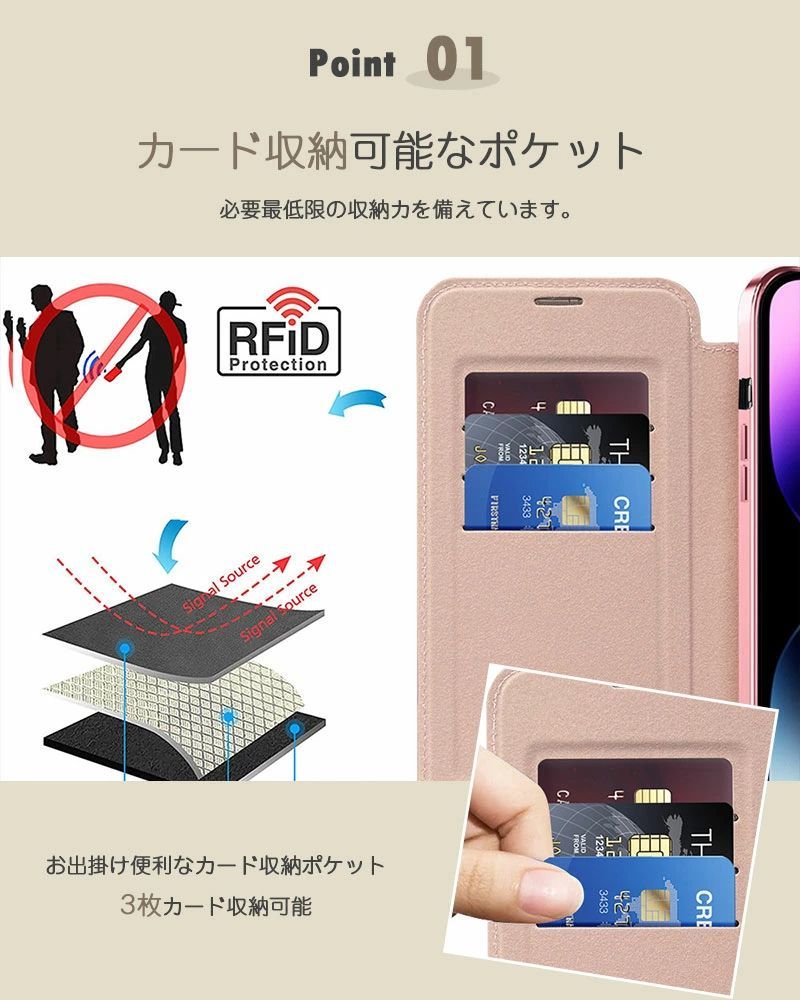 背面に3つのポケットあり、カードやお札など収納でき、おでかけに便利です。スキミング防止機能も搭載しており、個人情報を守る工夫を施しています。