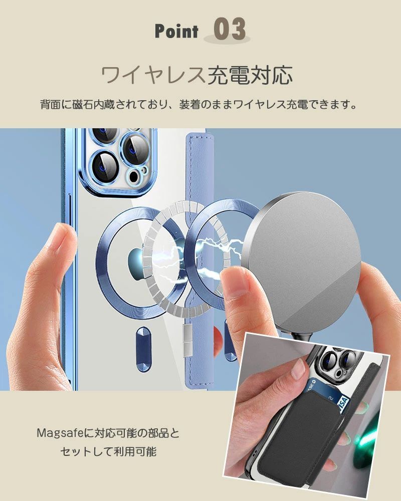 バックパネルにメタルが内蔵されており、ワイヤレス充電器および磁気吸着式モバイルバッテリーやカードケースなど、各種アクセサリーが利用できます。