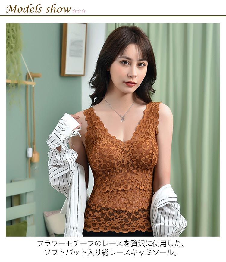 フラワーモチーフのレースを贅沢に使用した、ソフトパット入り総レースキャミソール。