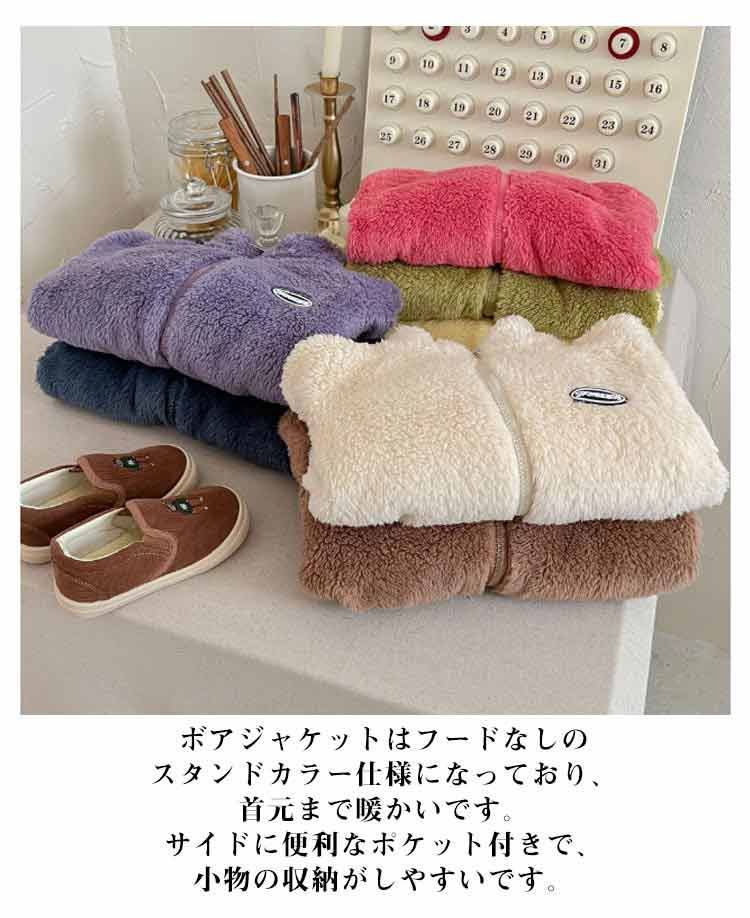 ボアジャケットはフードなしのスタンドカラー仕様になっており、首元まで暖かいです。サイドに便利なポケット付きで、小物の収納がしやすいです。