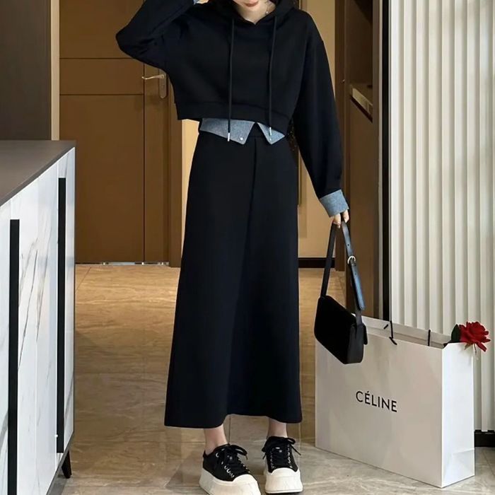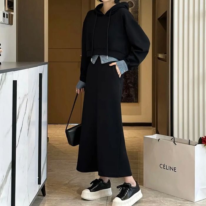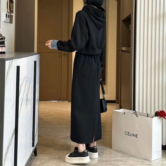 セットアップ レディース スカート スリット 上下セット パーカー カジュアル 春 秋 冬 おしゃれ きれいめ スウェット セット トップス ボトムス ゆったり 体型カバー 長袖 ロング 大人可愛い 20代 30代 40代 50代 黒 xinshang01