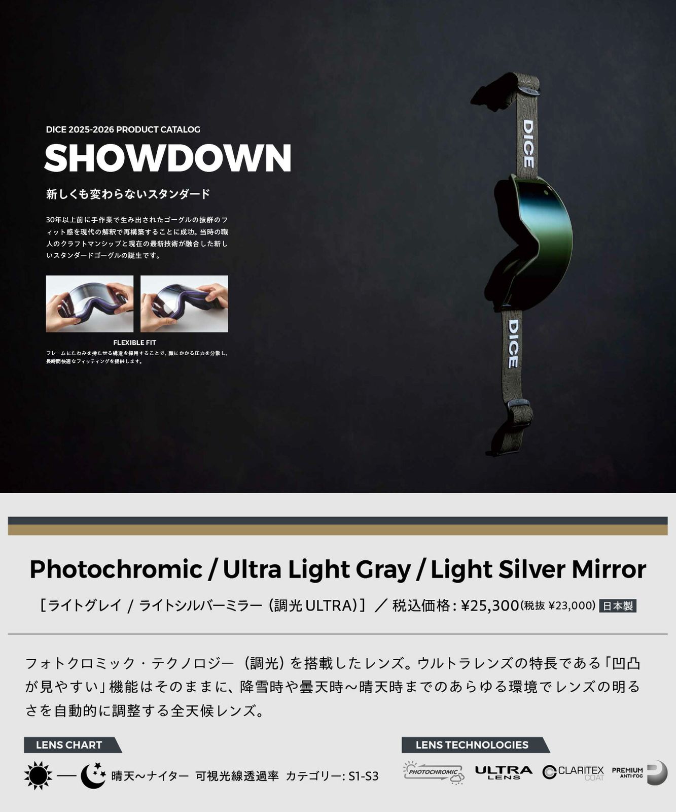 Photochromic / Ultra Light Gray / Light Silver Mirror:可視透過率:15-60%(S1-S3)