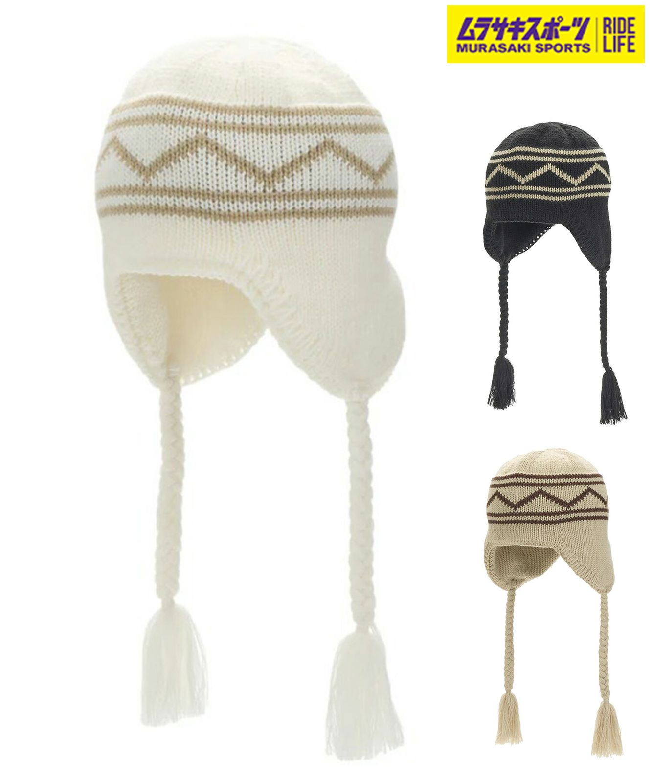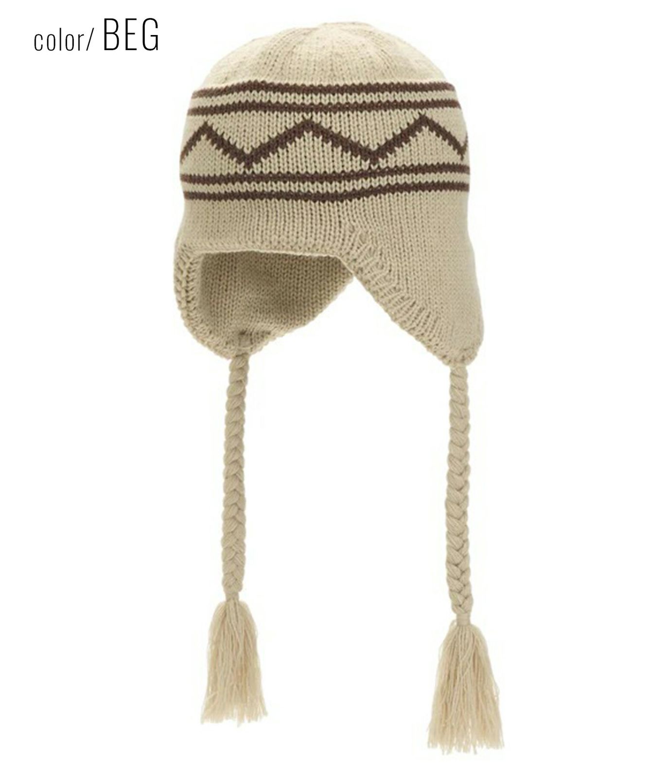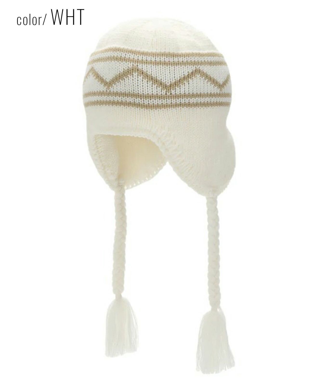 レトロなパターン柄が目を引く、ローゲージニットのイヤーフラップビーニー。
