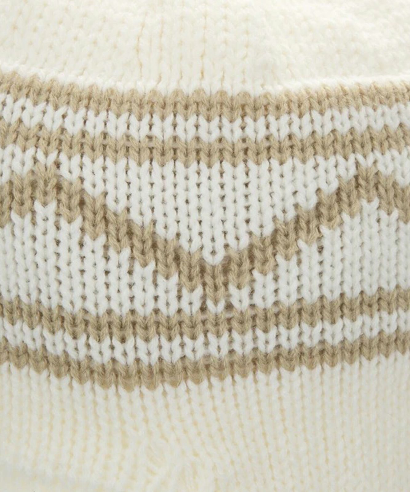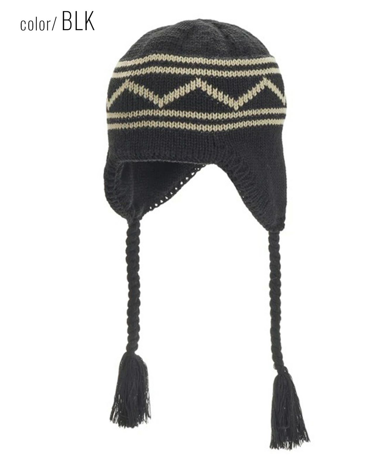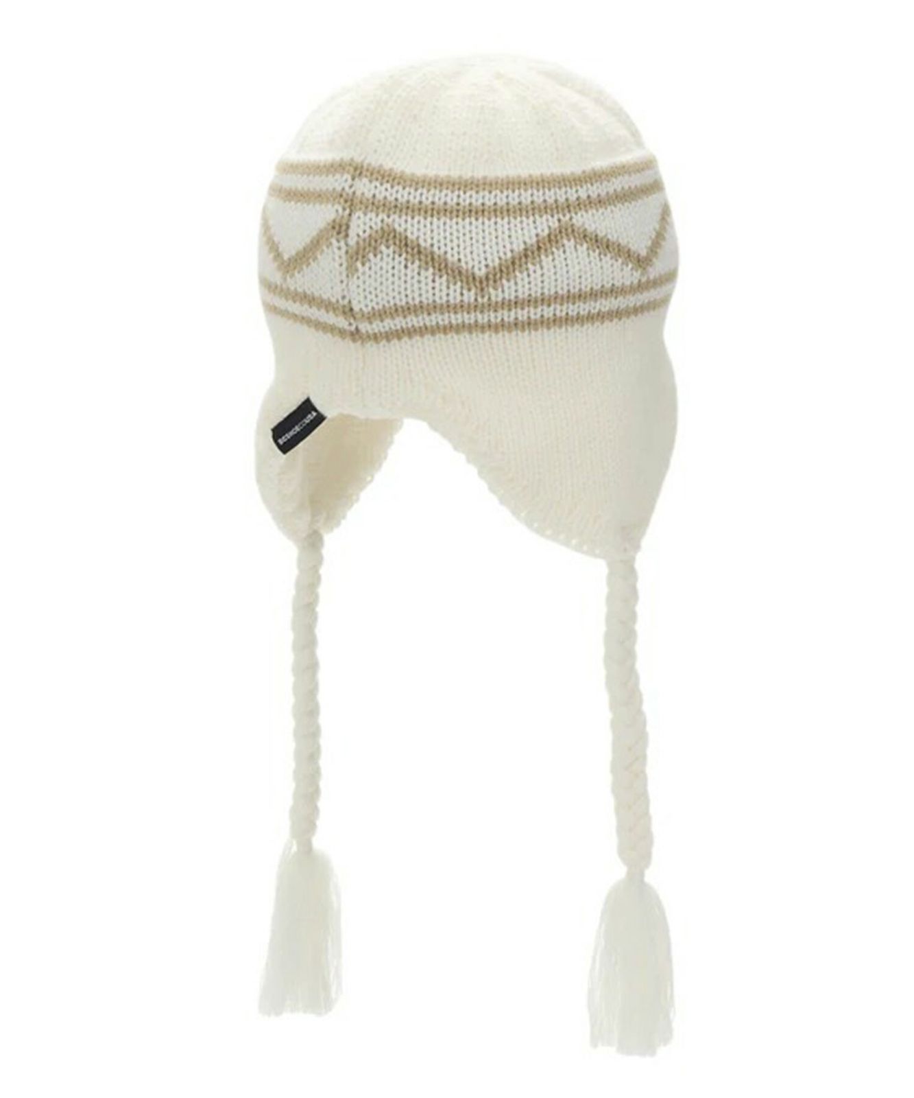 レトロなパターン柄が目を引く、ローゲージニットのイヤーフラップビーニー。