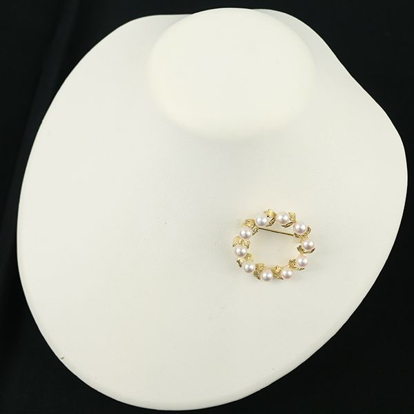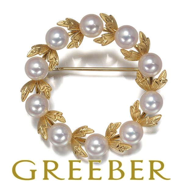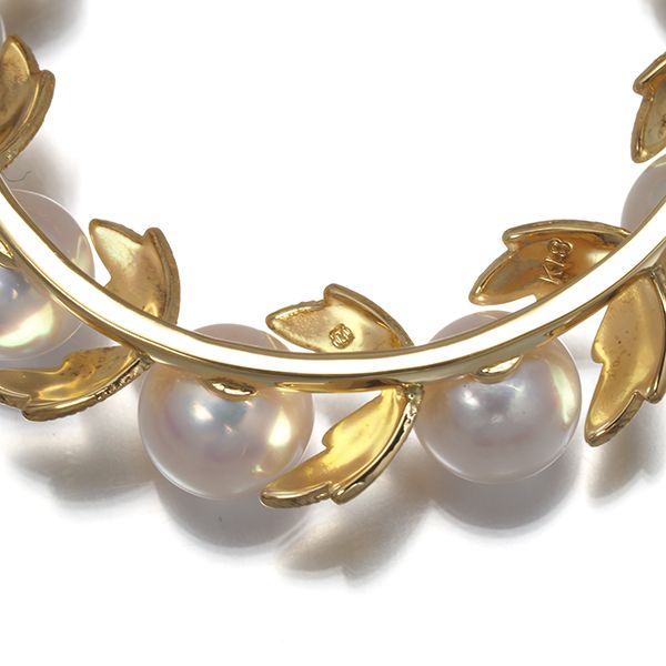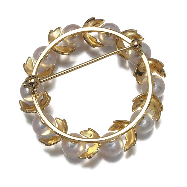 ホワイト系のお色味に華やかなピンクの干渉色を浮かべるテリ艶が美しい ミキモト厳選アコヤ真珠のブローチ。丁寧な彫金細工で描かれたリーフの煌めきも美しい贅沢な逸品ジュエリーです。