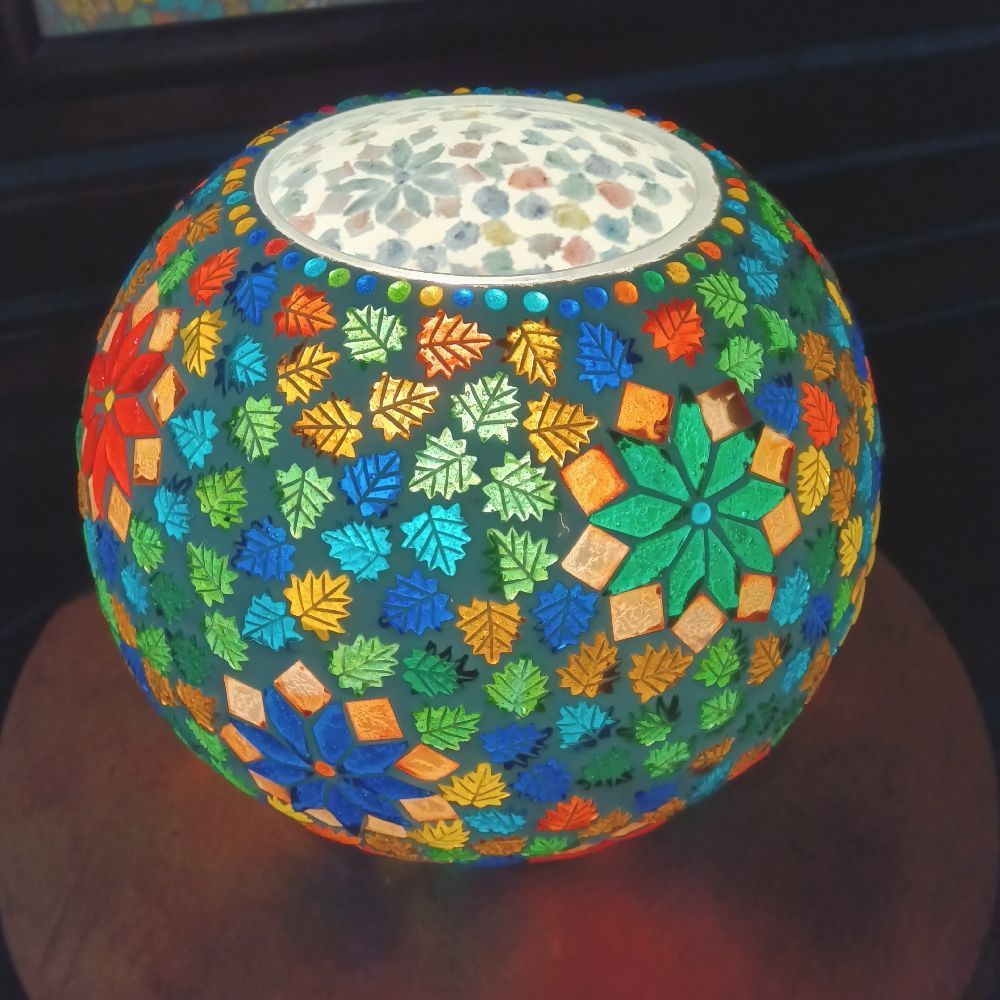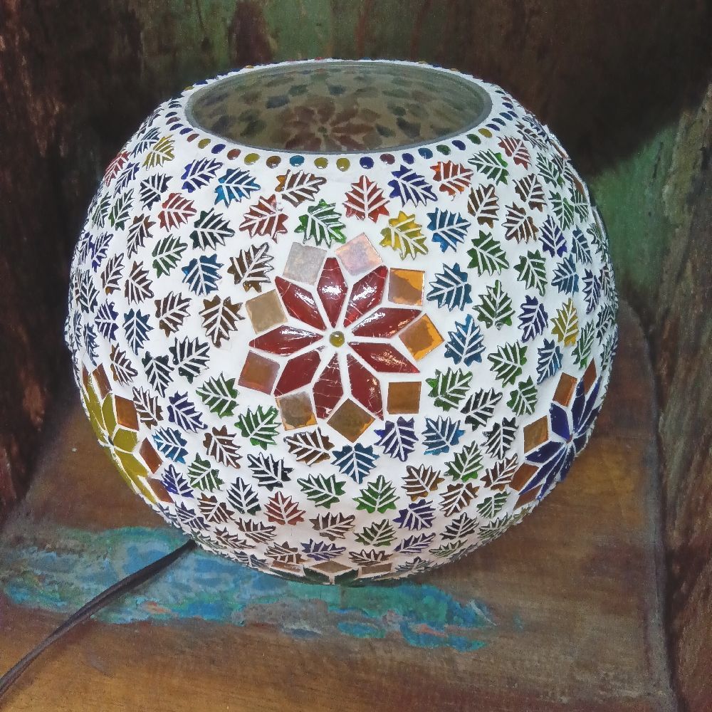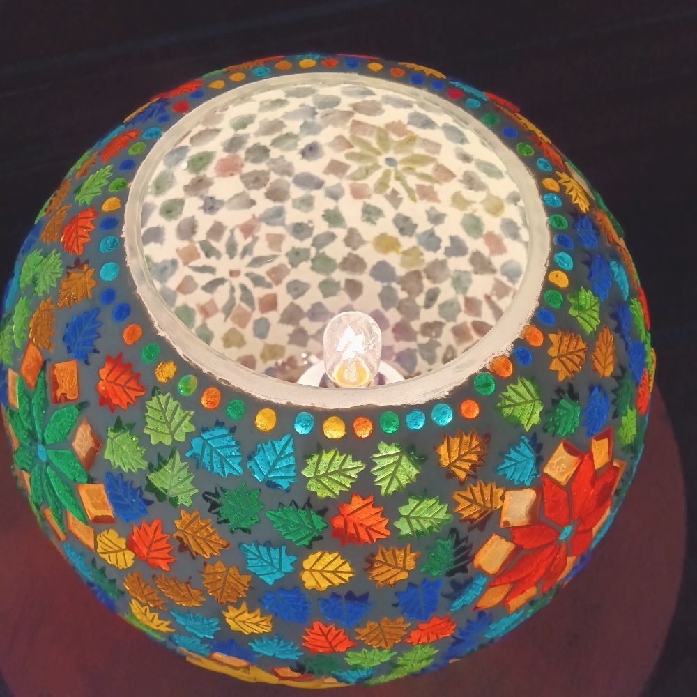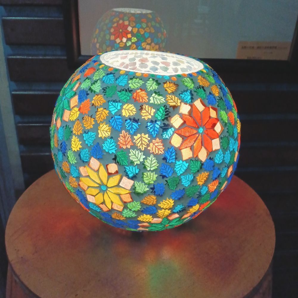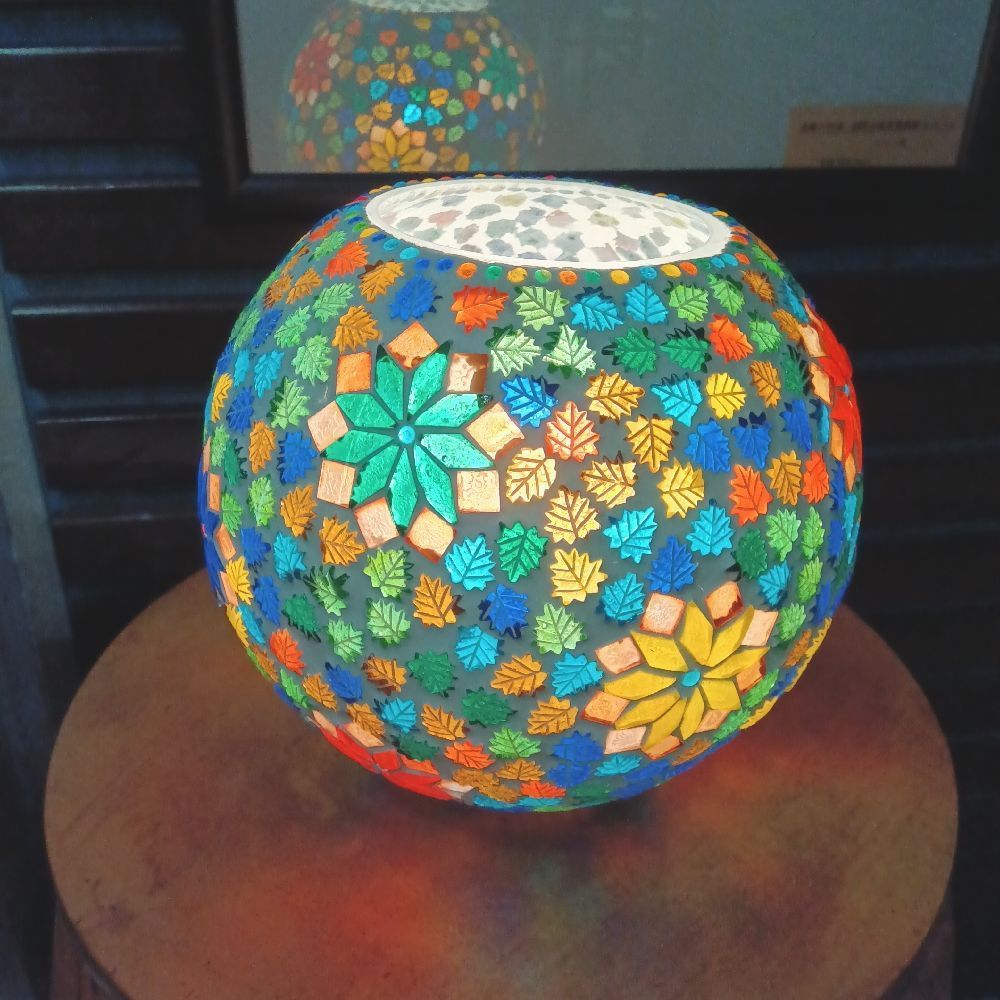 点灯時は、内蔵されたライトの柔らかな光がモザイクガラス全体を透かし、壁やテーブルに美しい光と影のパターンを映し出します。
