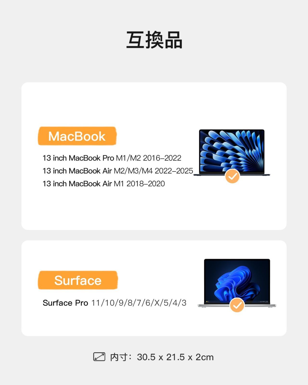 内部寸法:30.5x21.5x2cm;外部寸法:32.5x23.5x3cm。互換品13.3MacBook Pro 2016-2022(M2/A2686, M1/A2338, A2251, A2289, A2159, A1989, A1708, A1706)、13.3MacBook Air 2018-2020(M1/A2337, A1932, A2719)、13.6MacBook Air 2022-2025(M2/A2681,M3/A3113)。互換品Surface Pro 11/10/9/8/7/6/X/5/4/3。