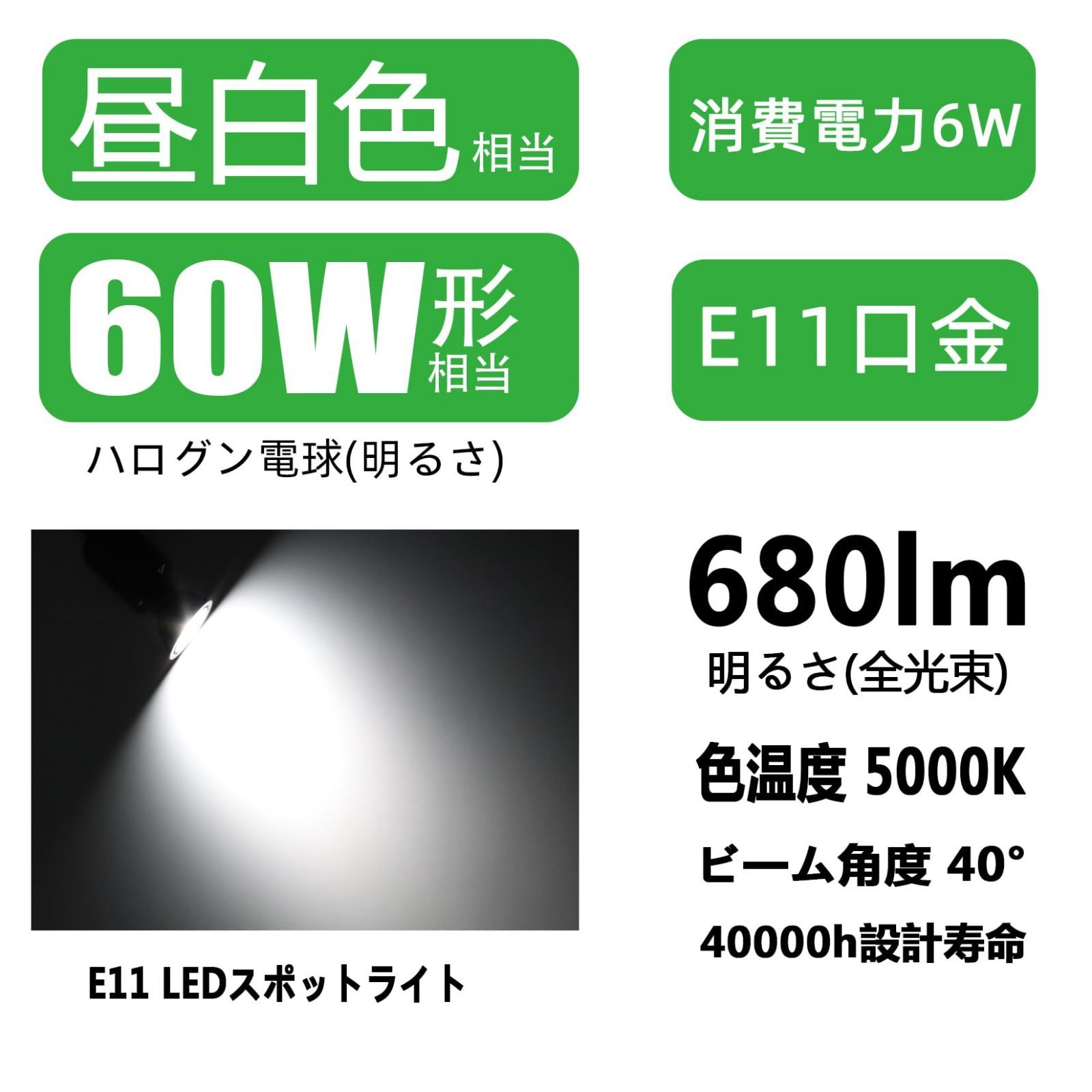 LED スポットライト E11口金 LED電球 60w形相当 6W 昼白色 5000K 680lm 40°配光角 集光タイプ スポットライト 密閉型器具対応 ダクトレール照明 間接照明 商業照明 看板 ダイニング リビング照明 調光不可 2個セット (昼白色, ホワイト 2個入)