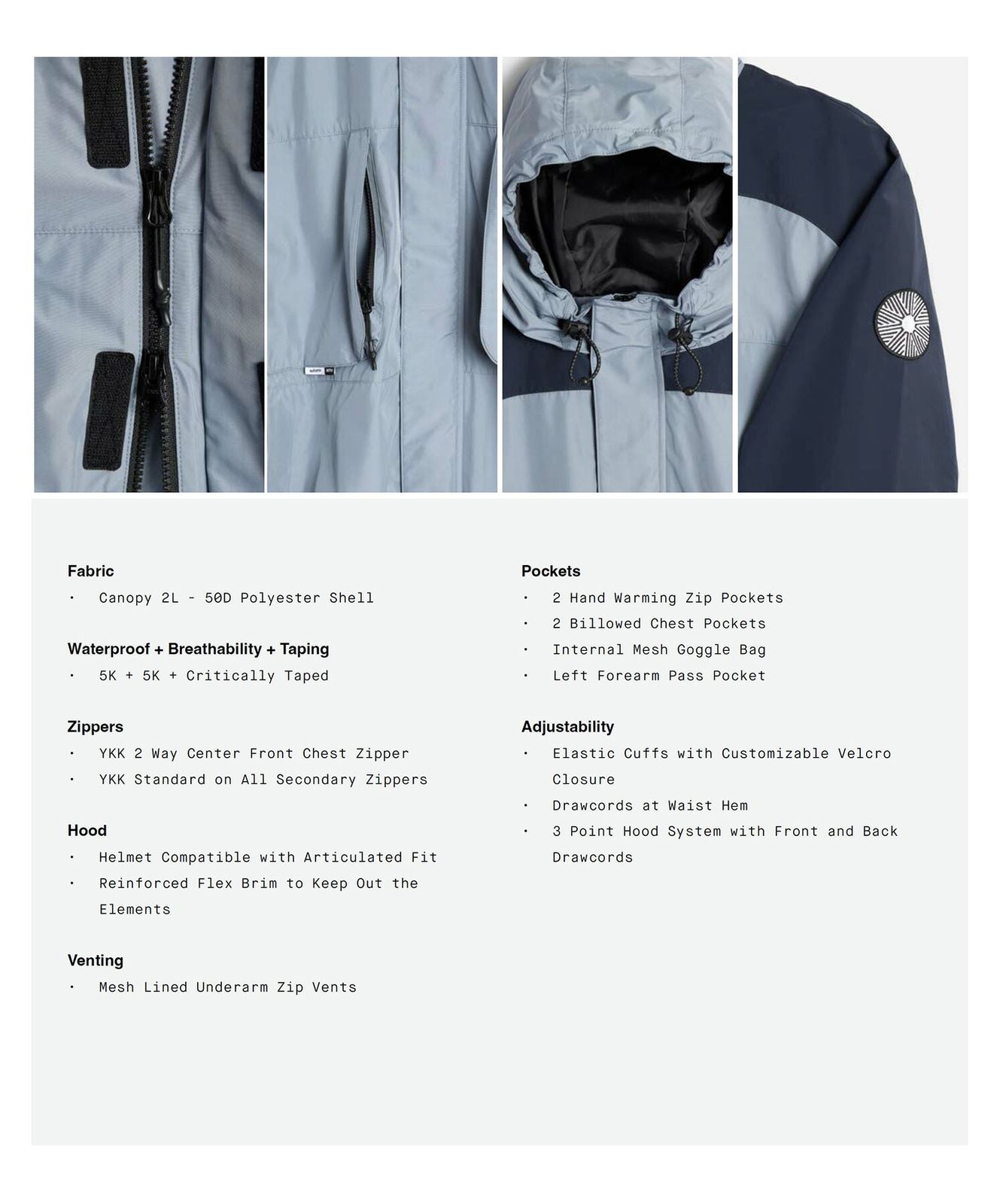 Canopy 2Lの50Dポリエステルシェルが優れた耐久性と快適な着心地を実現し、5Kの防水・透湿性能に加え、クリティカルテーピングで必要な箇所の防水性を強化。
