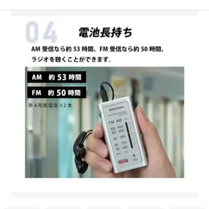 ■ 乾電池持続時間(アルカリ乾電池新品使用):AM受信約53時間、FM受信約50時間