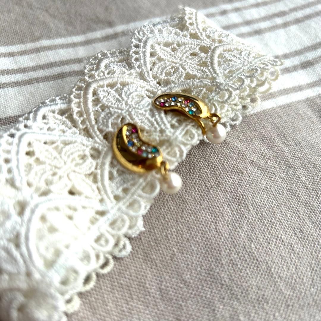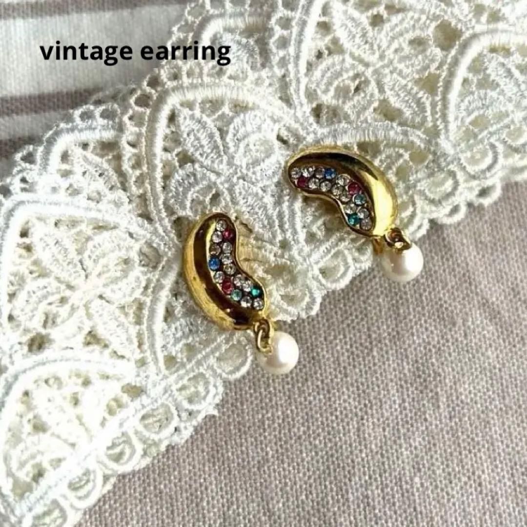 ゴールドのお豆型にカラフルなビジューがたっぷり付いたビンテージイヤリングです。下にはパールがゆらゆらと揺れ可愛らしく華やかなアイテム