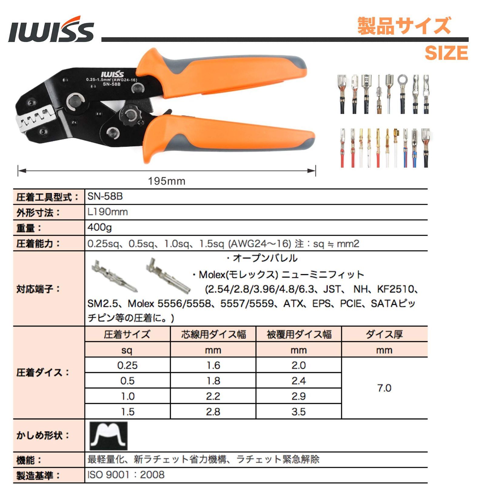 アイウィス(IWISS) 精密同時圧着ペンチ ラチェット式 オープンバレル端子 0.251.5mm2小・中型端子対応 SN-58B
